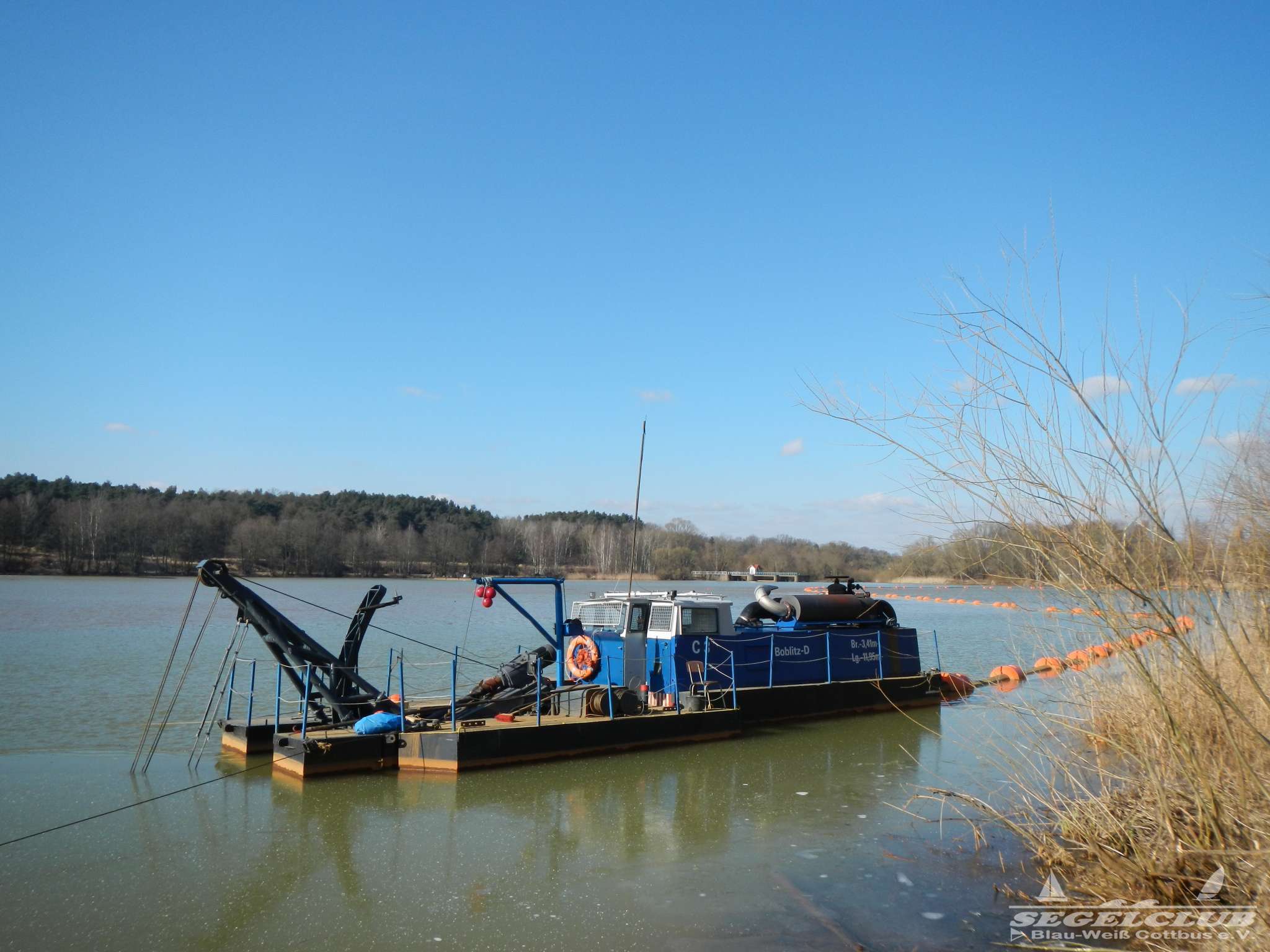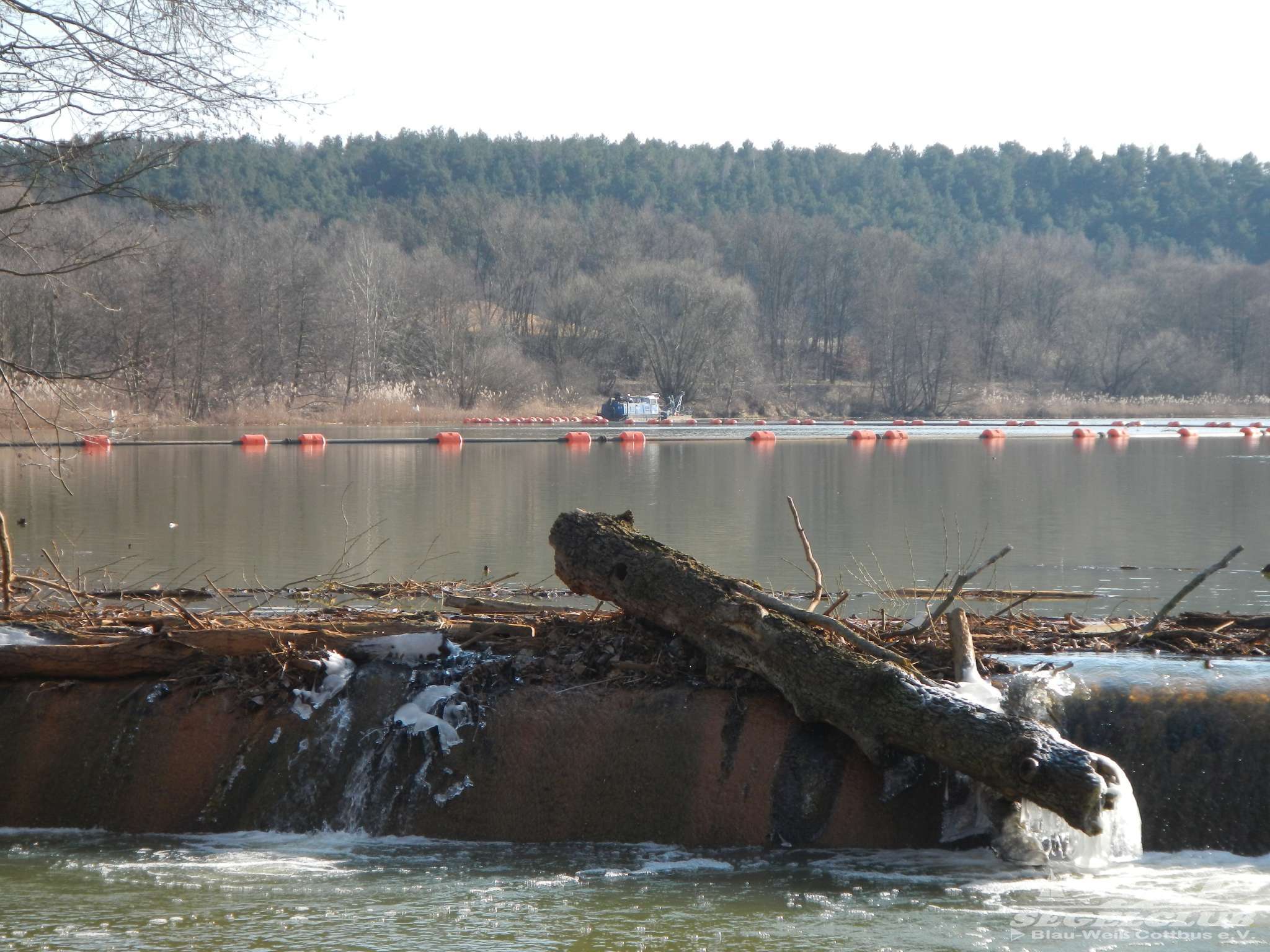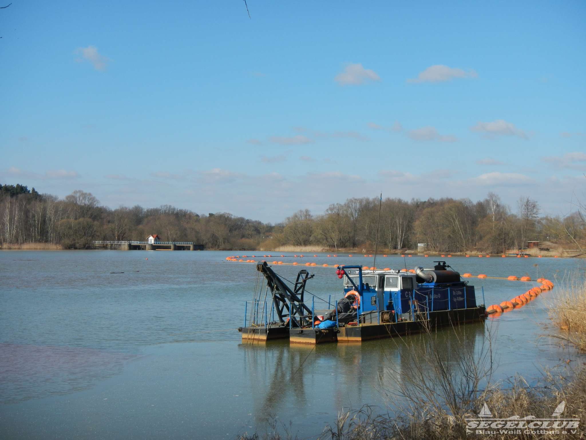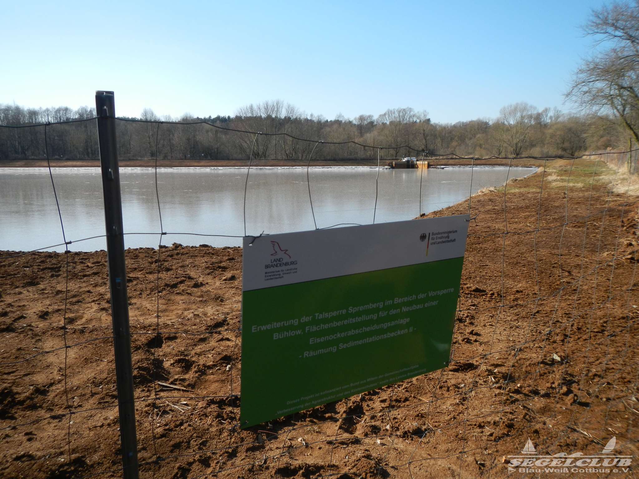 Ich wusste das Flußaufwärts des Vorstaubeckens eine Flockungsanlage eingebaut ist. Dort wird dem Wasser verschiedene Flockungsmittel zugesetzt was ein Binden des Eisenoxids fördern soll. Damit fallen dann während der Verweildauer im Vorstaubecken die Eisenoxidteile schneller zu Boden und es gelangen weniger davon in die Hauptsperre (unseren See). Um die Hauptsperre möglichst gut zu schützen muss dann das Vorstaubecken möglichst frei gehalten werden. Denn da lagern sich ja nun ständig neue Stoffe ab. Also muss das dort sich am Boden absetzende Material irgendwie auch wieder rausgebaggert werden. Das wurde das letzte mal 2012 gemacht. Ein kürzlicher Entschluss brachte nun eine Entscheidung ins Land, welche bewirkt, das das Vorstaubecken nun jährlich einmal Ausgebaggert wird. Das wollten wir uns also anschauen.
