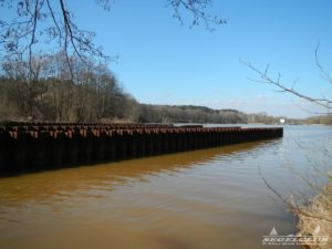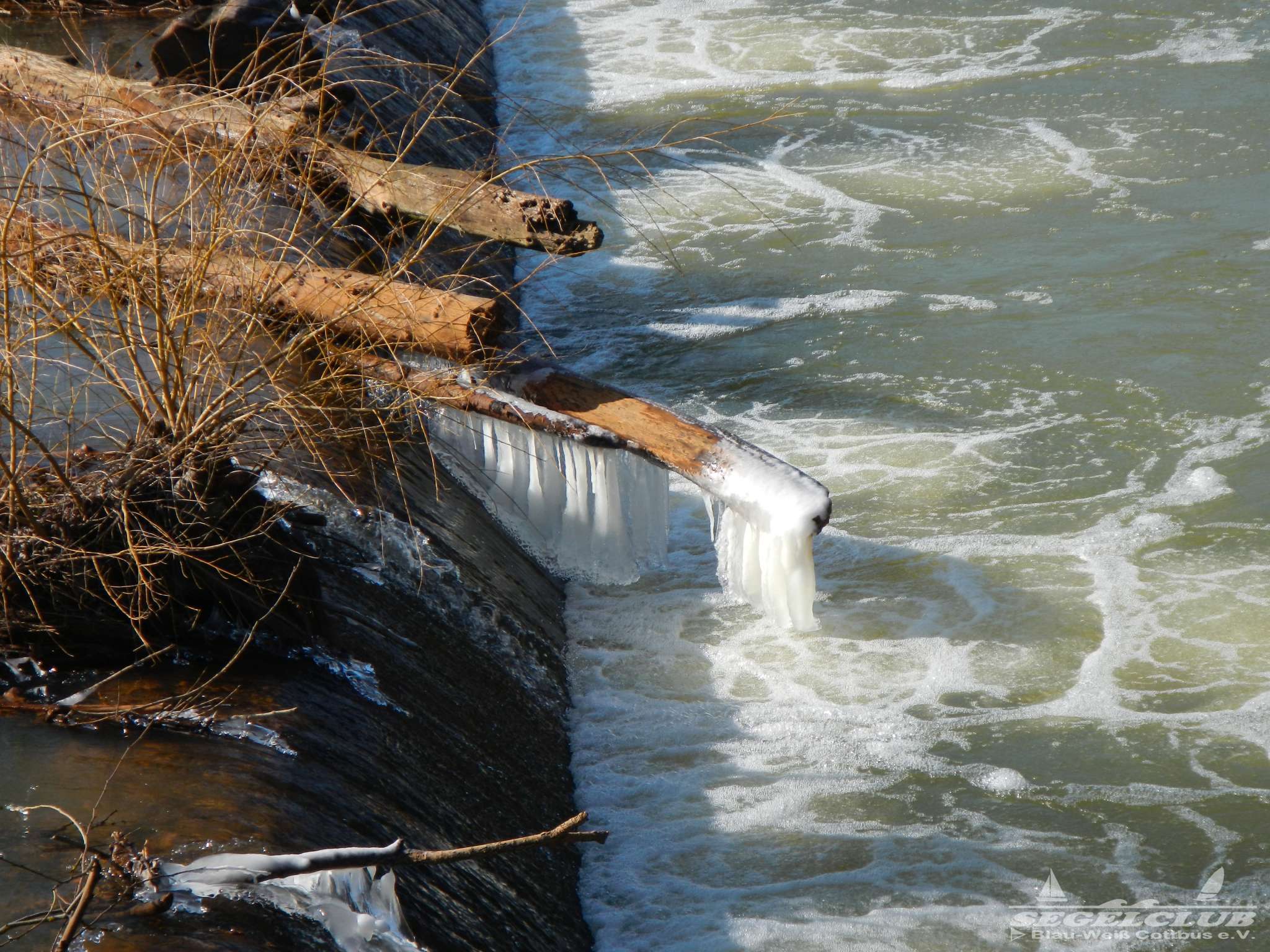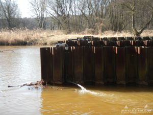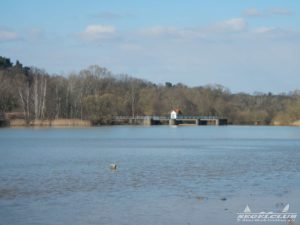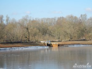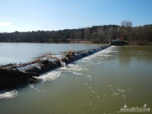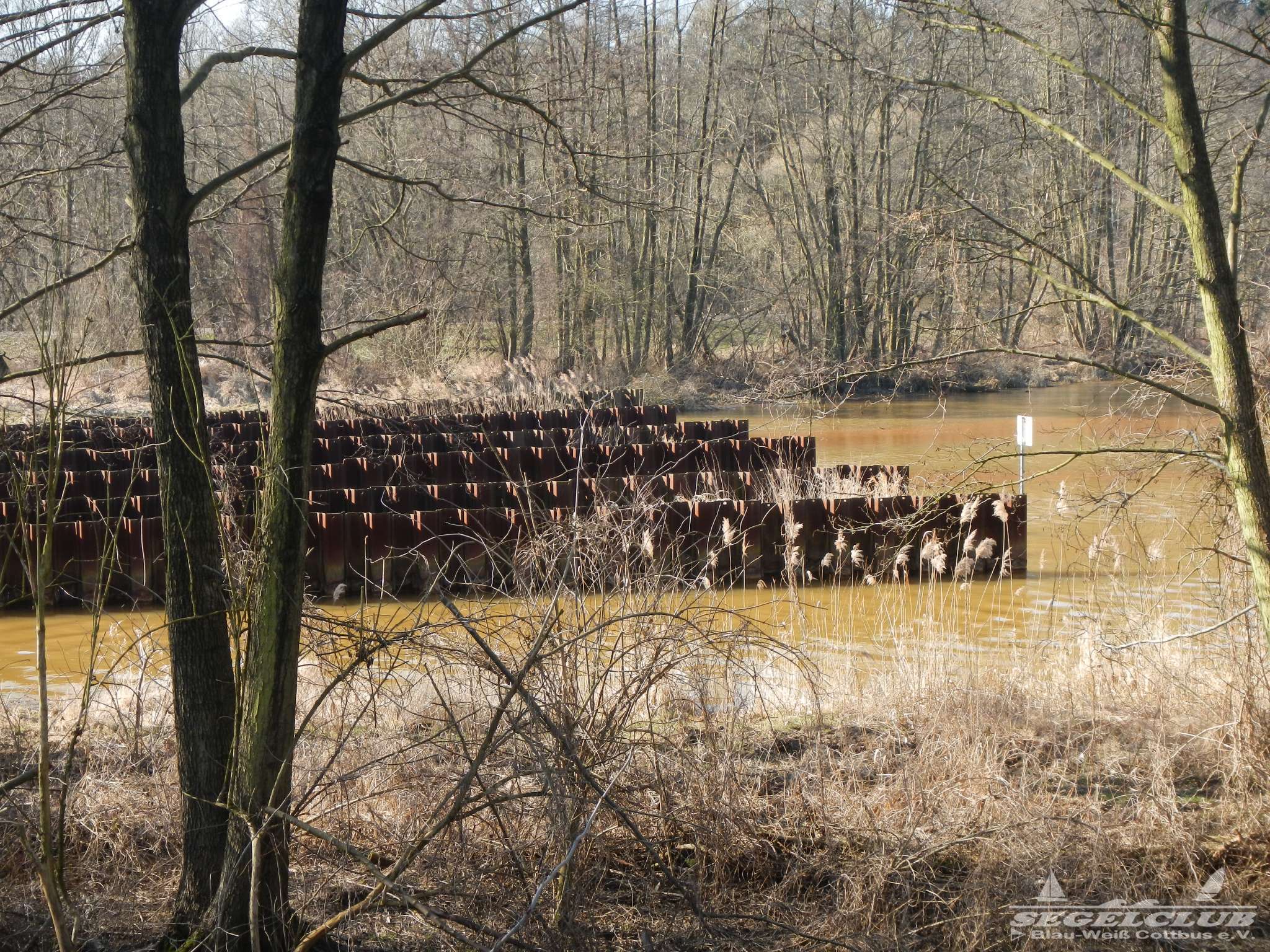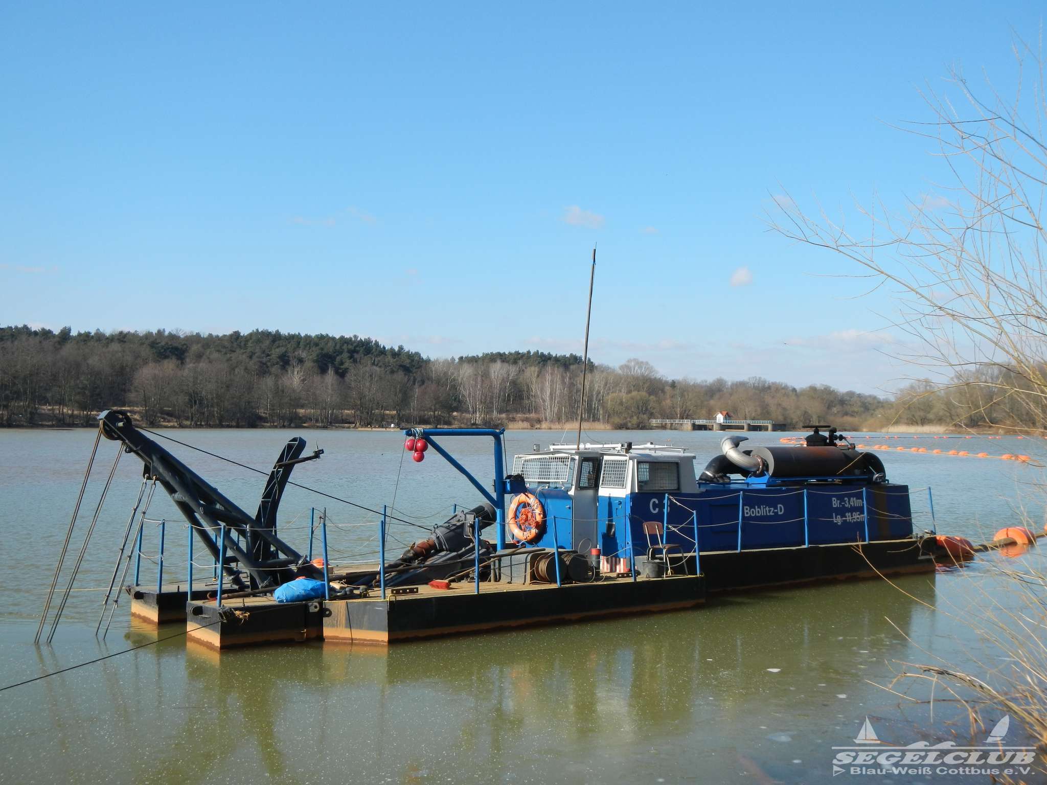 Ich wusste das Flußaufwärts des Vorstaubeckens eine Flockungsanlage eingebaut ist. Dort wird dem Wasser verschiedene Flockungsmittel zugesetzt was ein Binden des Eisenoxids fördern soll. Damit fallen dann während der Verweildauer im Vorstaubecken die Eisenoxidteile schneller zu Boden und es gelangen weniger davon in die Hauptsperre (unseren See). Um die Hauptsperre möglichst gut zu schützen muss dann das Vorstaubecken möglichst frei gehalten werden. Denn da lagern sich ja nun ständig neue Stoffe ab. Also muss das dort sich am Boden absetzende Material irgendwie auch wieder rausgebaggert werden. Das wurde das letzte mal 2012 gemacht. Ein kürzlicher Entschluss brachte nun eine Entscheidung ins Land, welche bewirkt, das das Vorstaubecken nun jährlich einmal Ausgebaggert wird. Das wollten wir uns also anschauen.