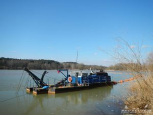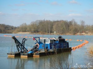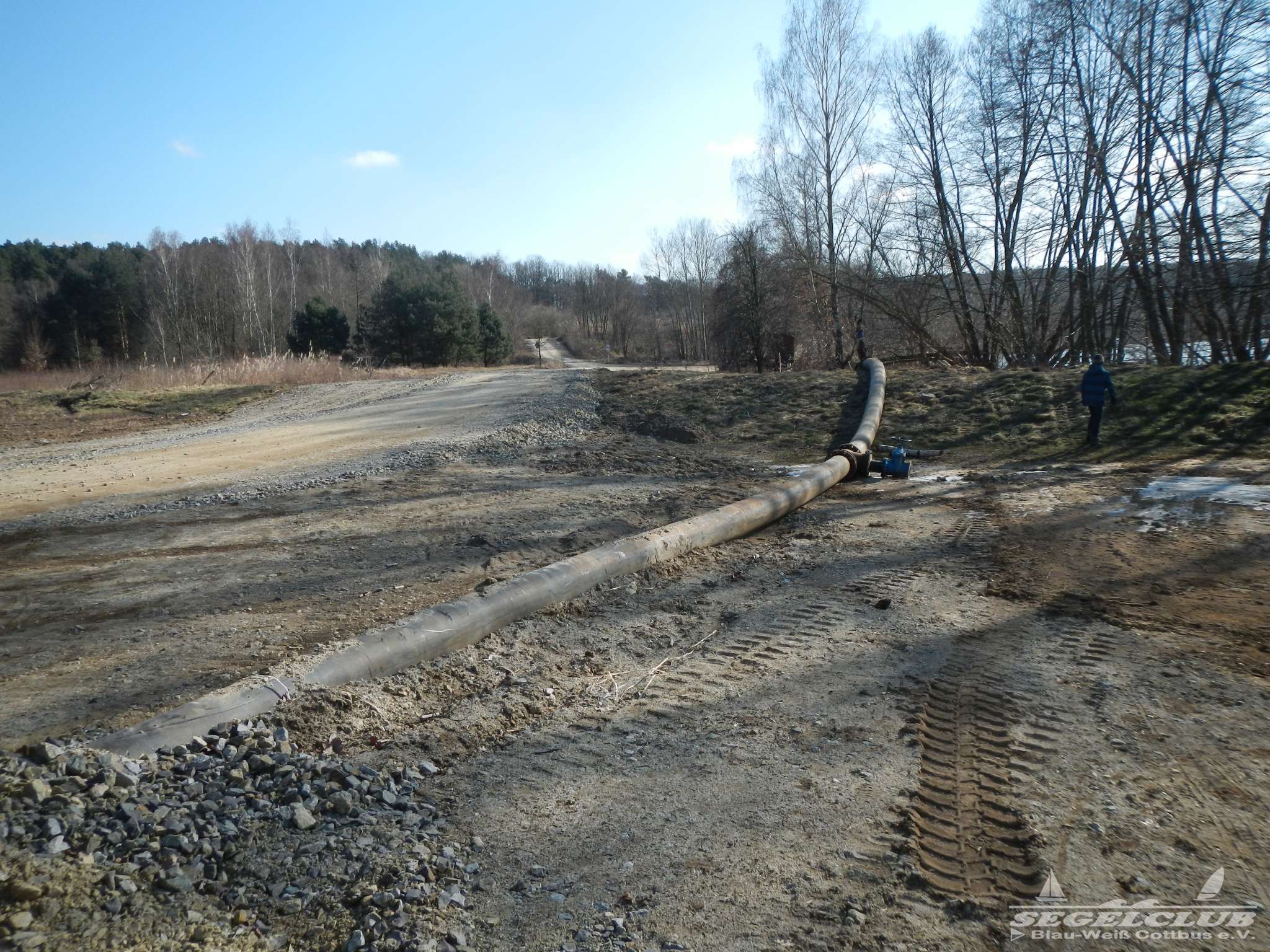 Dieses Rohr führte dann über eine lange Strecke (ca. 500m) direkt zur Vorsperre. Dort ging diese Eisenrohrtrasse dann über in ein flexibles dickes Gummirohr, welches über Schwimmkörper flexibel auf dem See schwimmen konnte. Dieses Rohr wiederum ist direkt an einem Schwimmbagger gekoppelt. Der kann sich frei über das Vorstaubecken bewegen und saugt das abgestandene Material vom Grund der Vorsperre ab und drückt es über die Rohrleitung derzeit ins Sedimentationsbecken II.