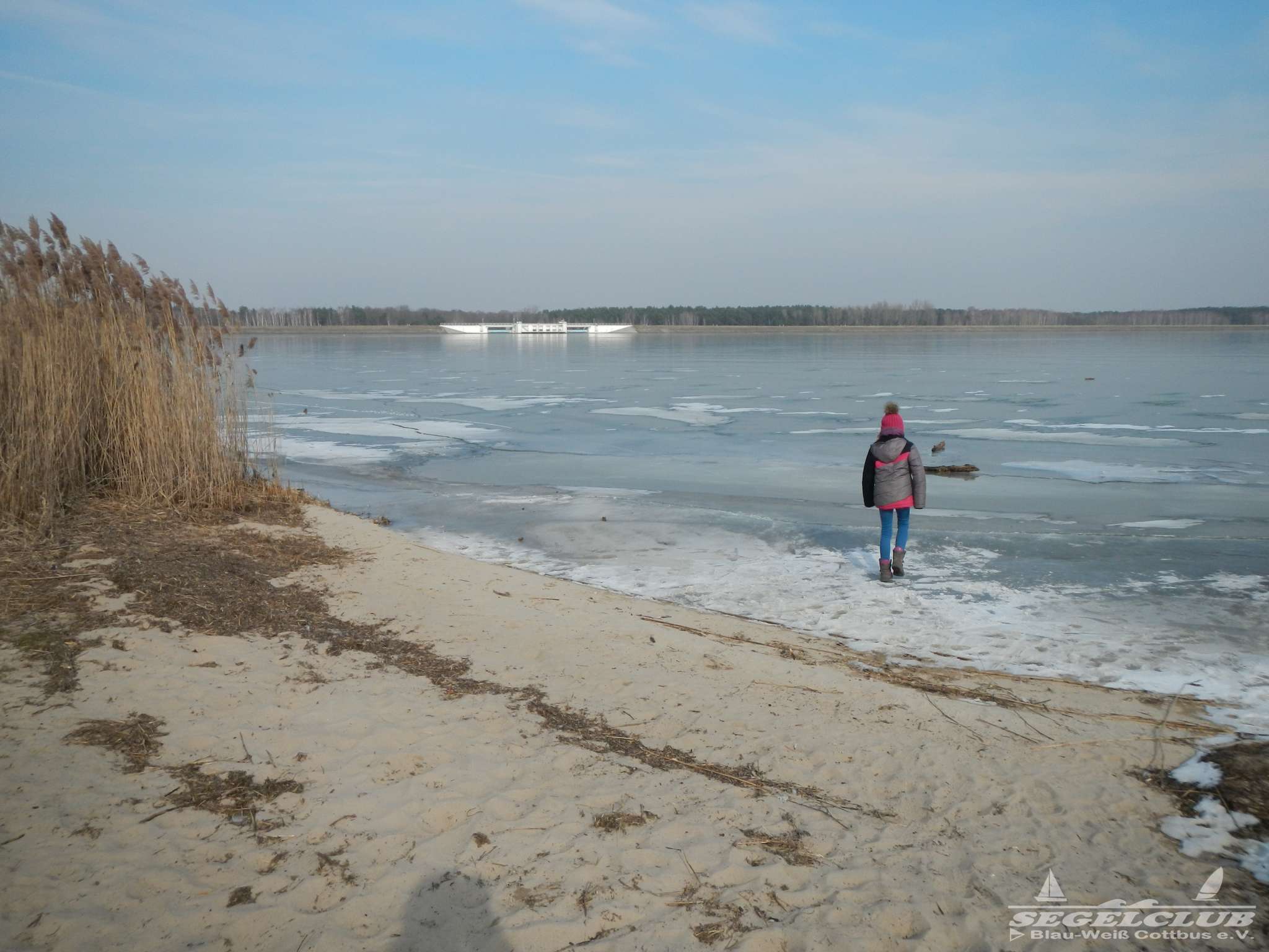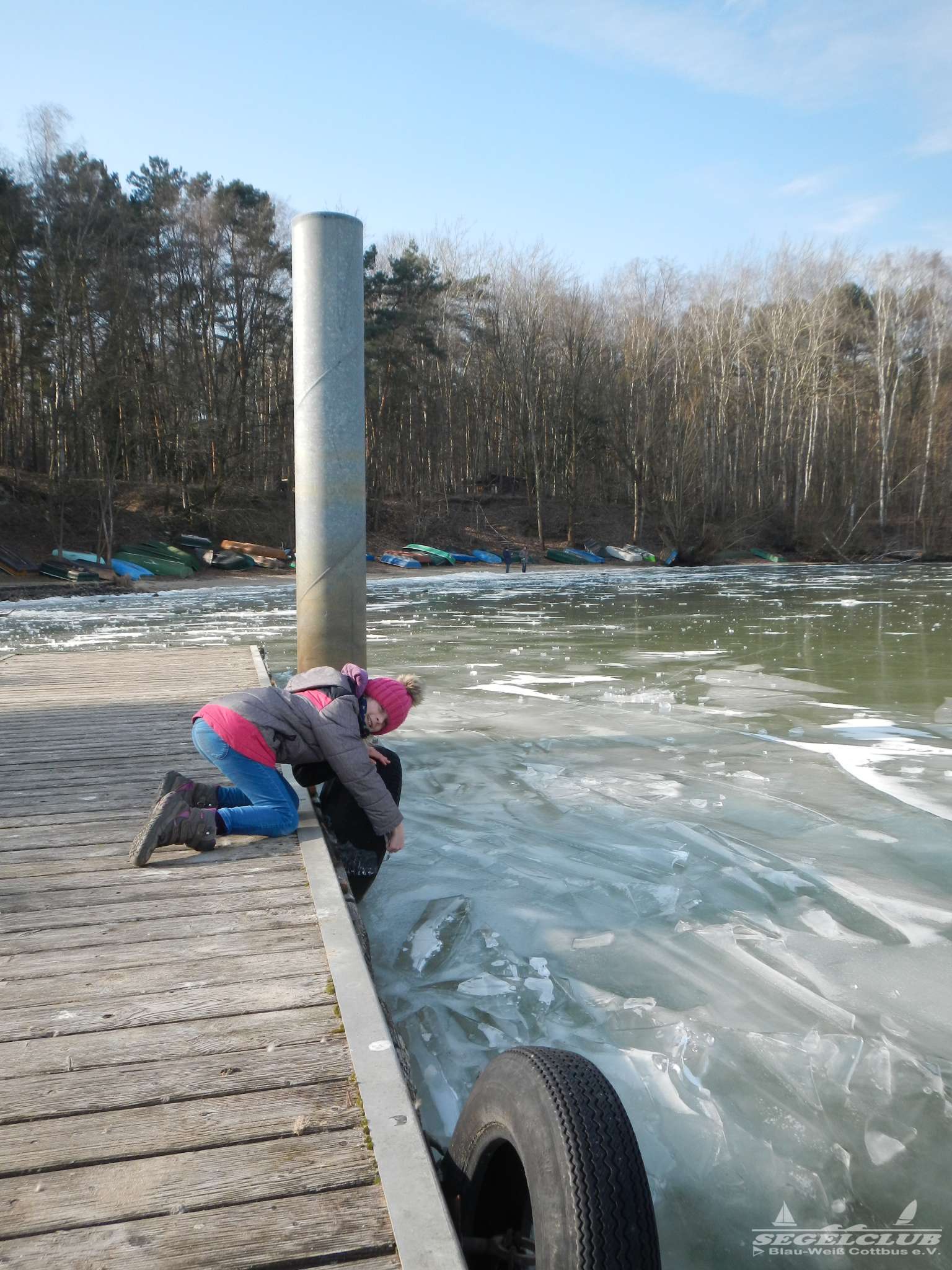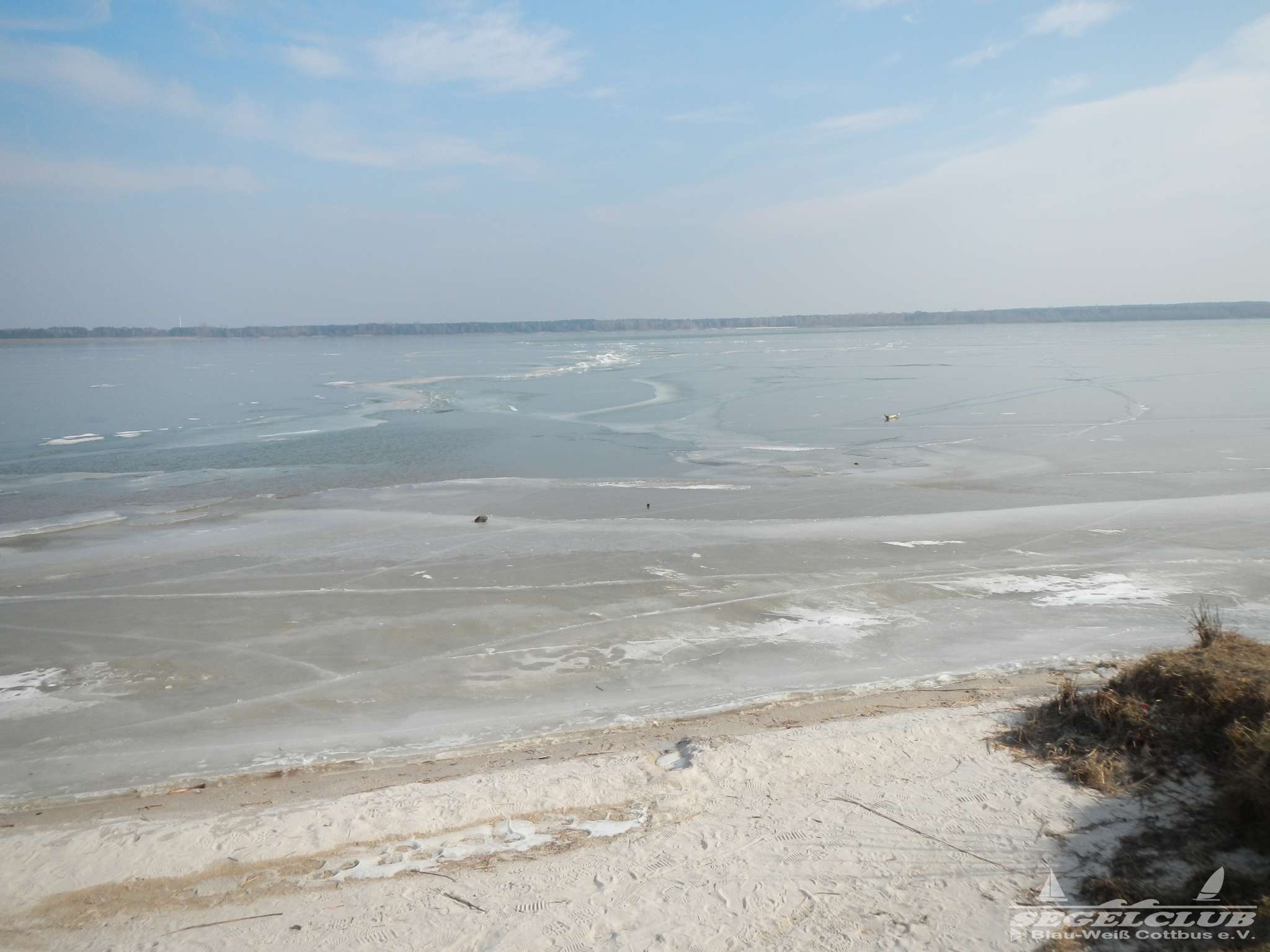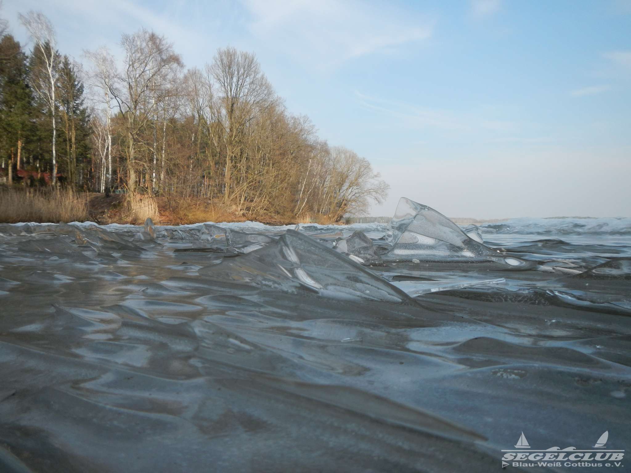 Dieses Wochenende unternahmen wir einen Ausflug an den See bei herrlicher Sonne und tollem Wetter ! Dank der vergangenen frostigen Tage und Nächte bei denen die Temperaturen teilweise bis zu -16 Grad sunken war der See zu großen Teilen zugefroren.Vorsicht war trotz allem geboten, denn schon nach wenigen Metern waren teilweise größere Risse und Furchen in der Eisdecke zu sehen. Meiner Schätzung nach hatte die Eisdecke am Rand eine Dicke von 15 bis 20 cm. Wir waren vorbildlich und liefen nur soweit hinaus aufs Eis wie es auch nur „Gürtel-tief“ unterm Eis war.
