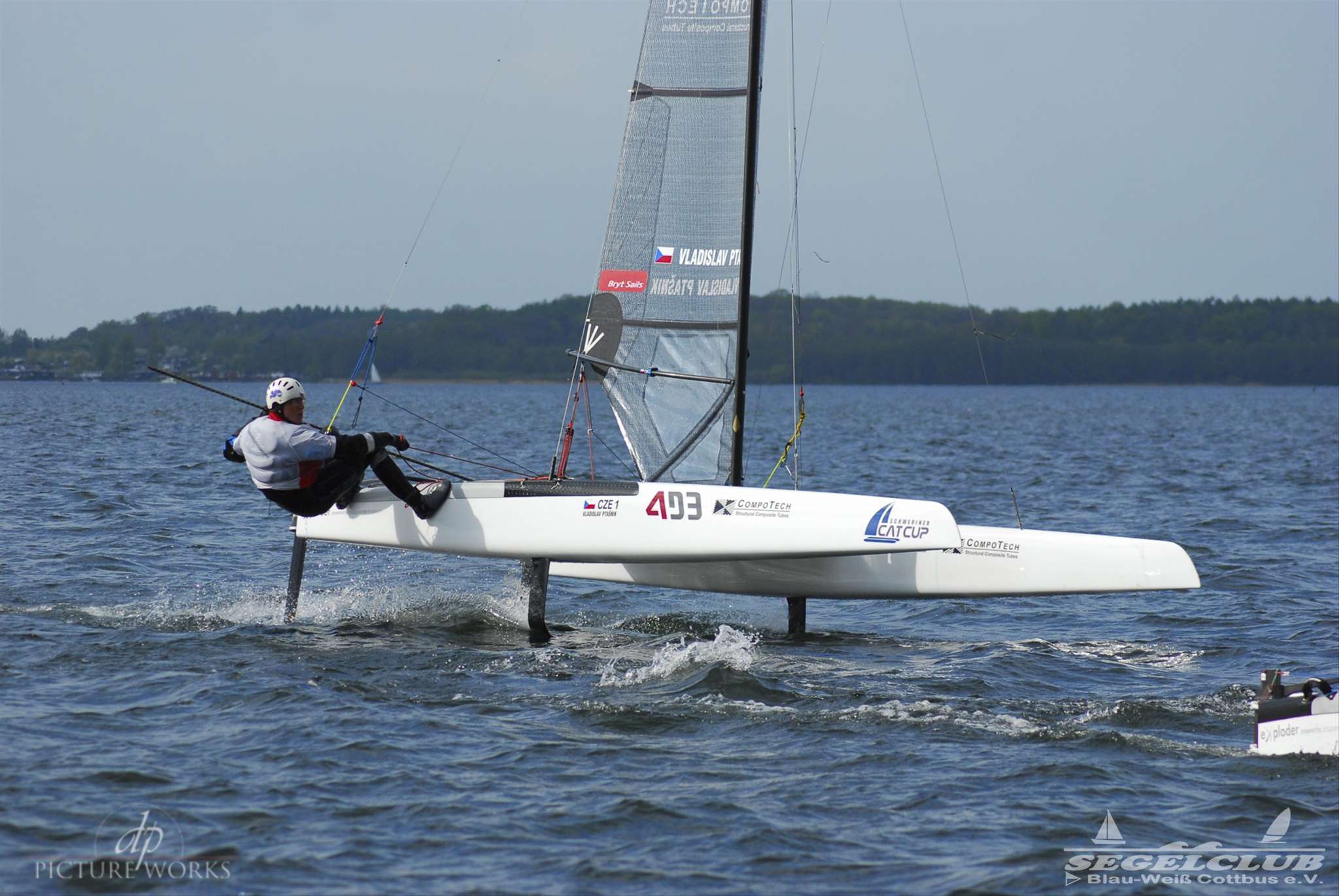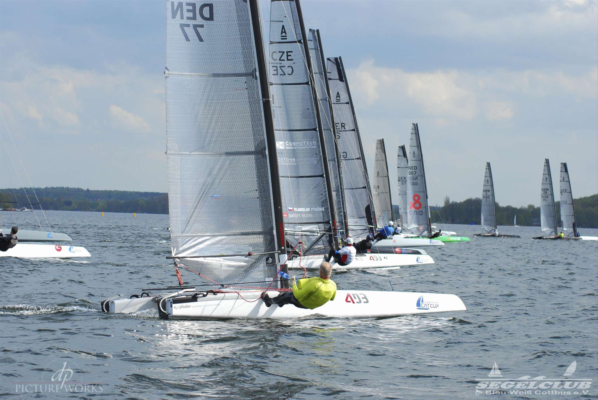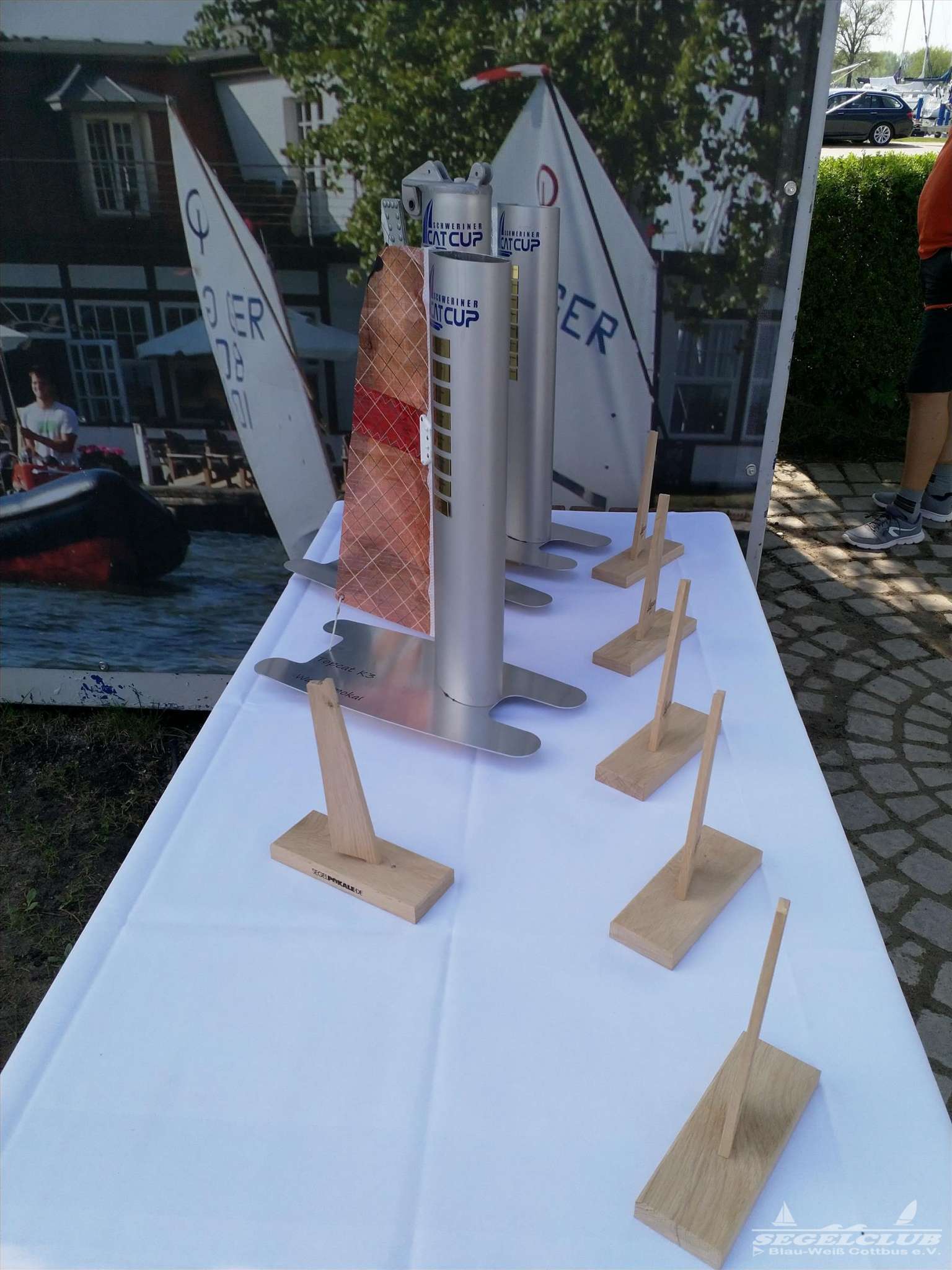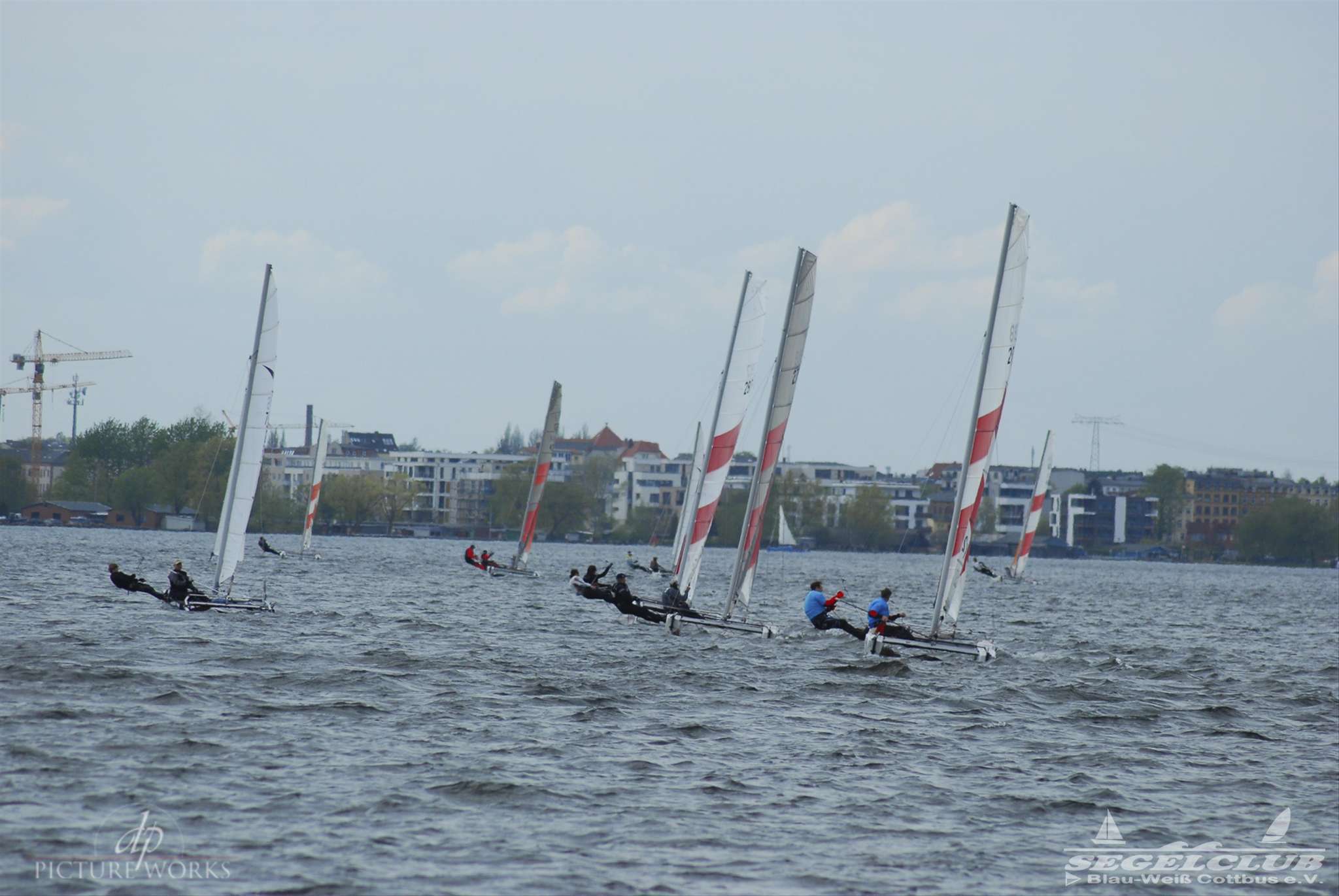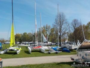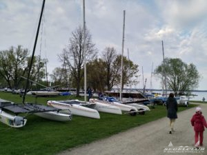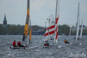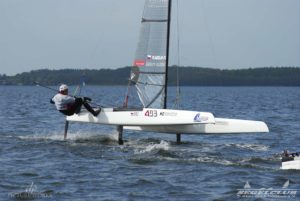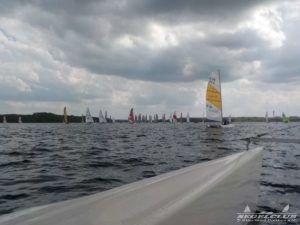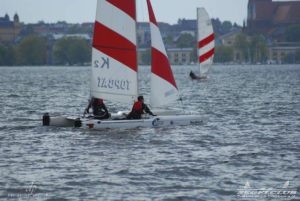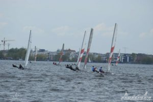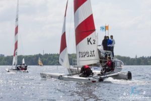 Dieses Jahr tragen die A-Cat (eine andere Klasse) im Rahmen des Schweriner Catcup Ihre IDB (Internationalen Deutsche Bestenermittlung) aus. Die A-Cat gehören zu den schnellsten einhandgesegelten Booten und haben seit letzten Jahr gebogene Schwerter, mit welchen sie wie beim America’s Cup foilen können.