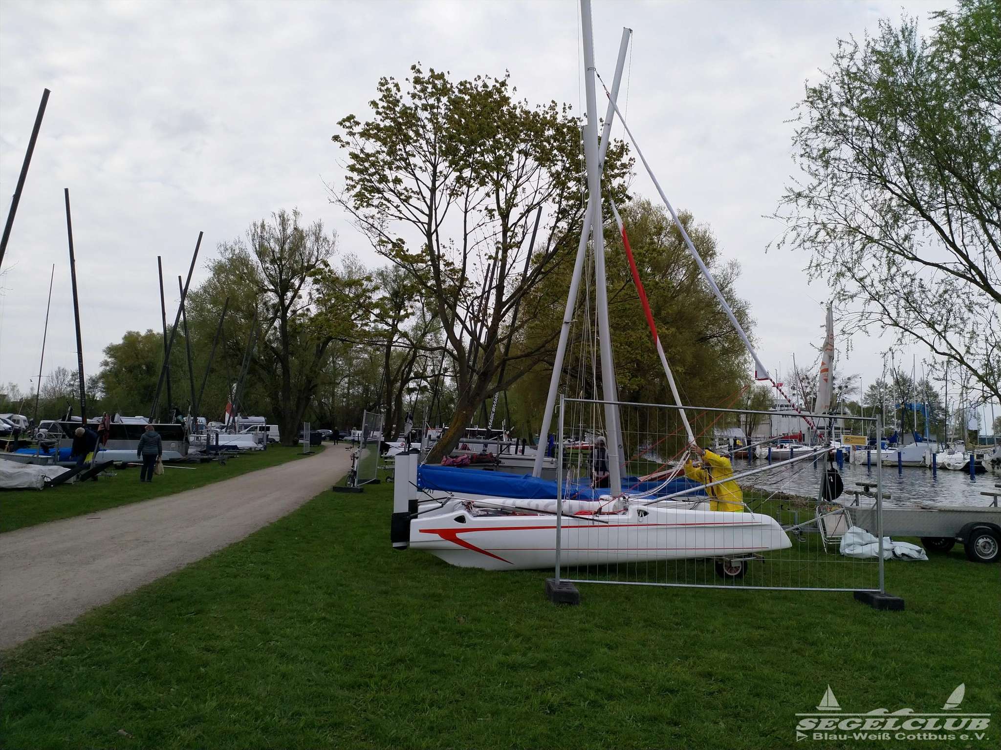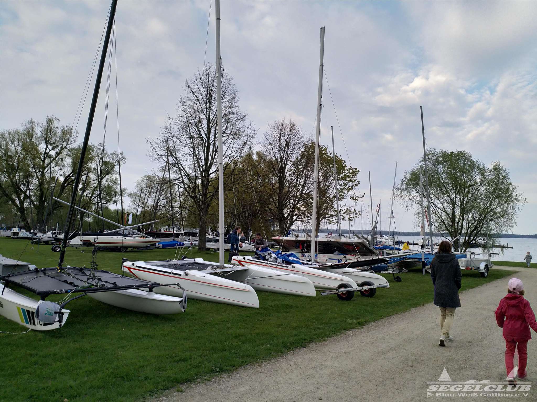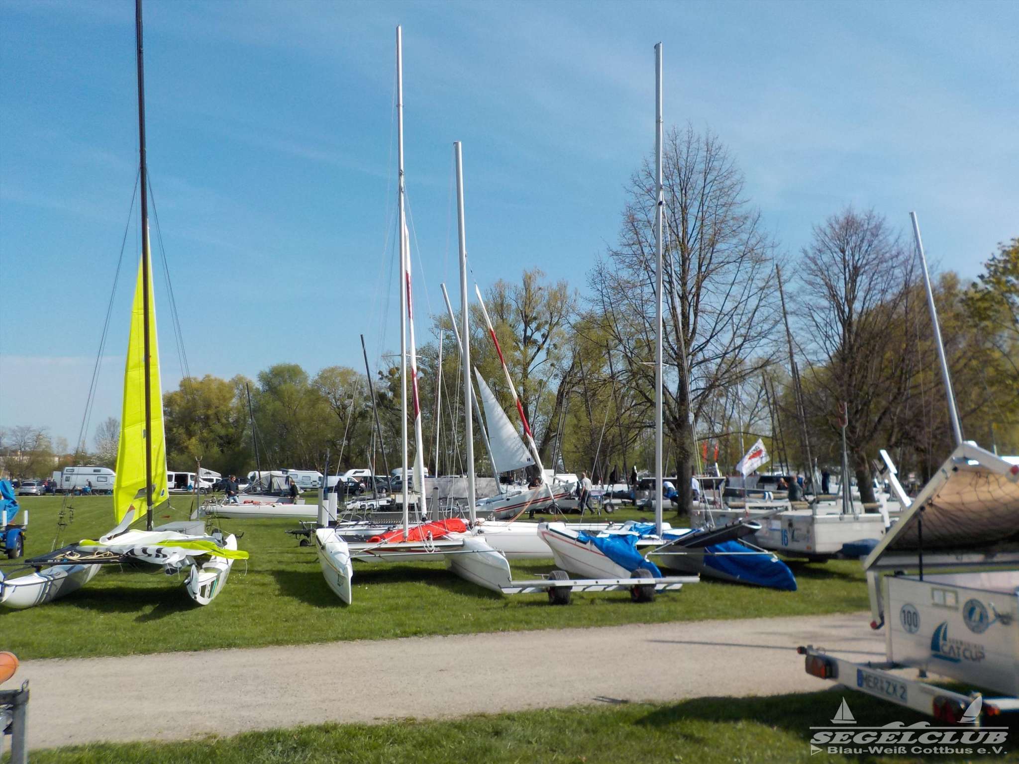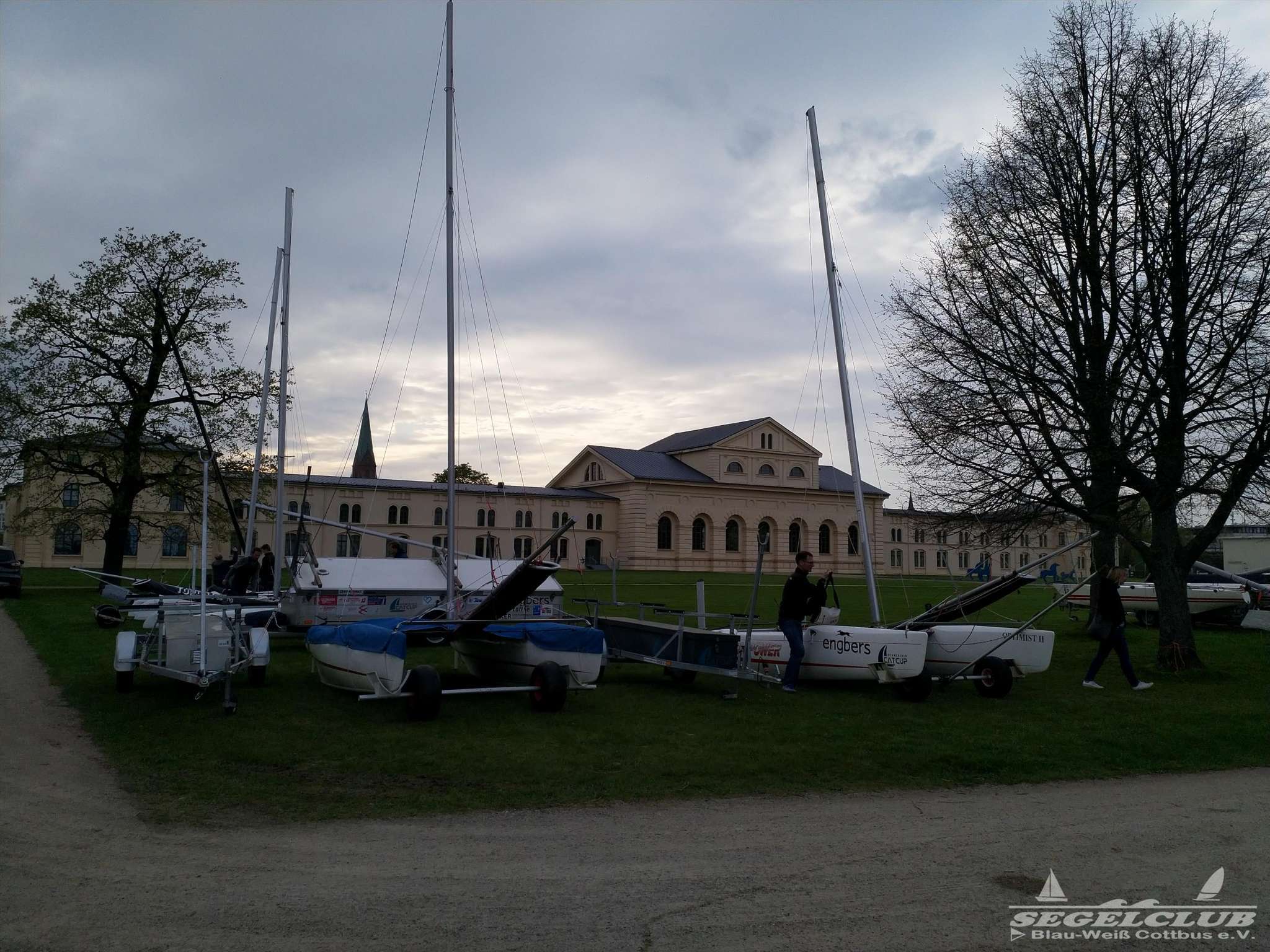 Bereits am Freitag bei der Ankunft war auf der Wiese der „Marstall Halbinsel“ die eigens für das Event abgesperrt war schon ein reges Treiben. Die über 60 Teams bauten Ihre Katamarane der verschiedenen Klassen (A-Cat, Dart18, Hobie16, Topcat K1, Topcat K2, Topcat K3) direkt vor den Ministerien des Landes Mecklenburg-Vorpommern auf. Zwei portable Rampen für den leichteren Zugang zum See waren auch extra für das Wochenende installiert worden.