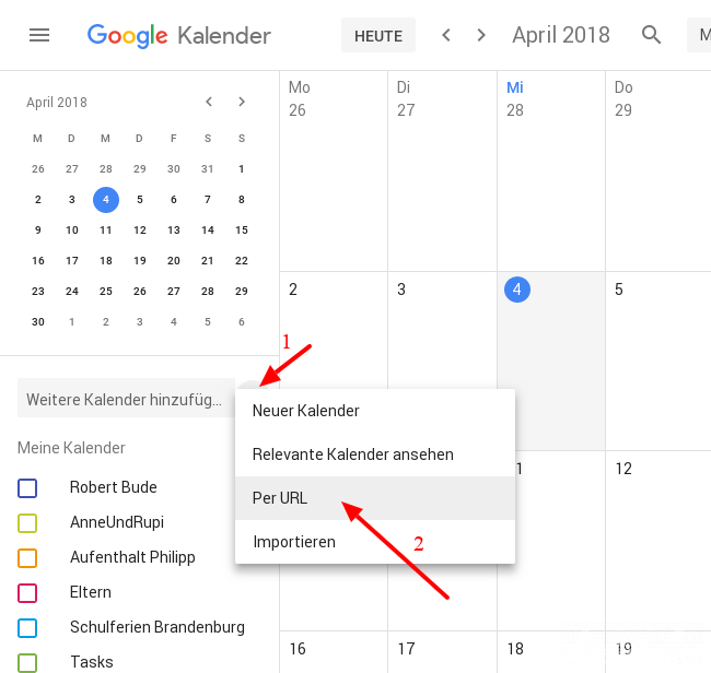 Bei Android Telefonen muss der Kalender über die Weboberfläche von Google (am besten auf einem PC oder Laptop abonniert werden. Ich hab derzeit keine Möglichkeit gefunden das über die App im Handy direkt zu machen. Also geht auf Euren Google Kalender über einen Browser (Internet Explorer, Google Chrome, Firefox …) und folgt dann den Screenshots