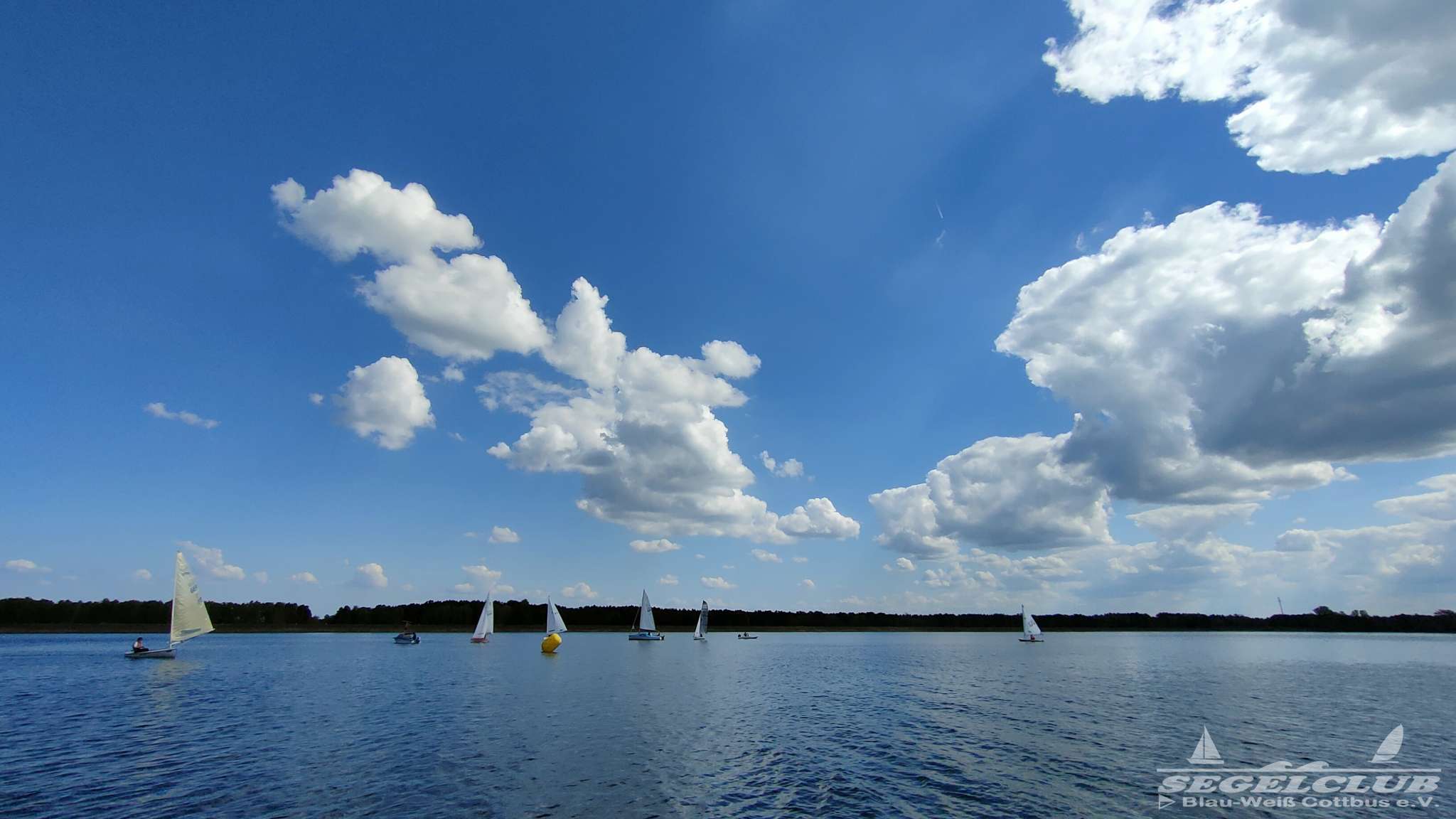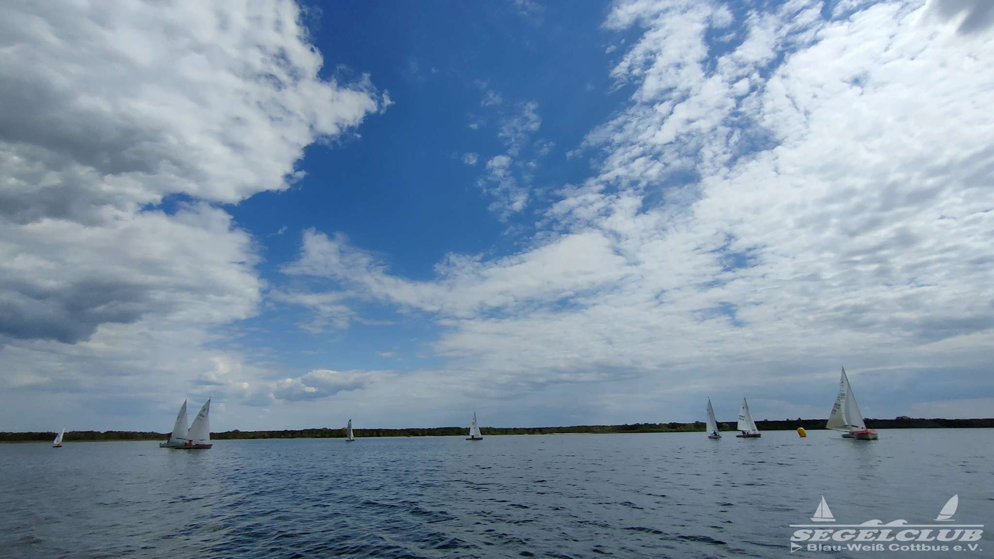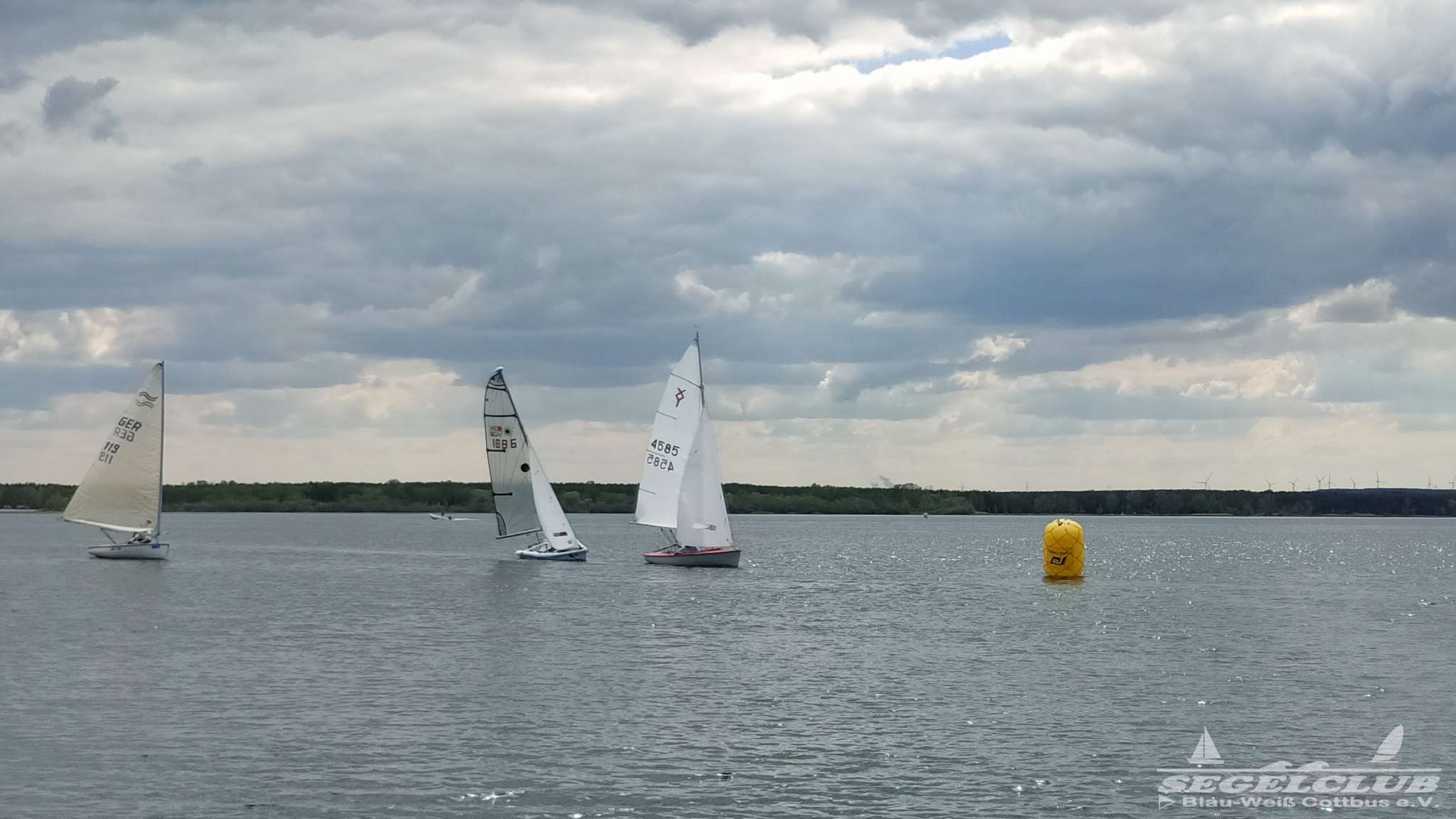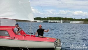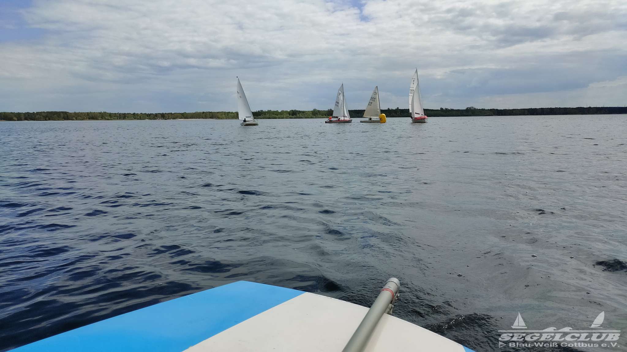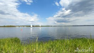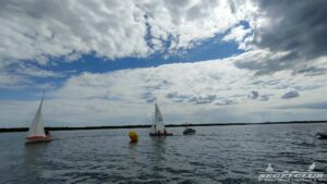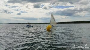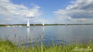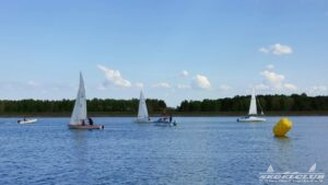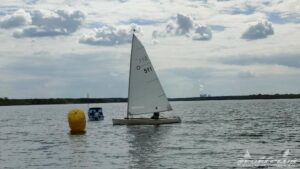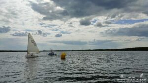 Um 10 Uhr legten wir einen Dreieckskurs auf dem See aus aus drei großen Tonnen (die gelben Bojen, gut auf den Fotos unten zu sehen). Normalerweise legt man einen Kurs so aus, dass man bei der ersten Strecke genau gegen den Wind fahren muss. Man muss dann kreuzen, also zickzack gegen den Wind. Das war diesmal gar nicht so einfach. Bei dem wenigen Wind, dreht dieser auch von einer Minute auf die andere. Deswegen war eine gute Kurslegung kaum möglich.