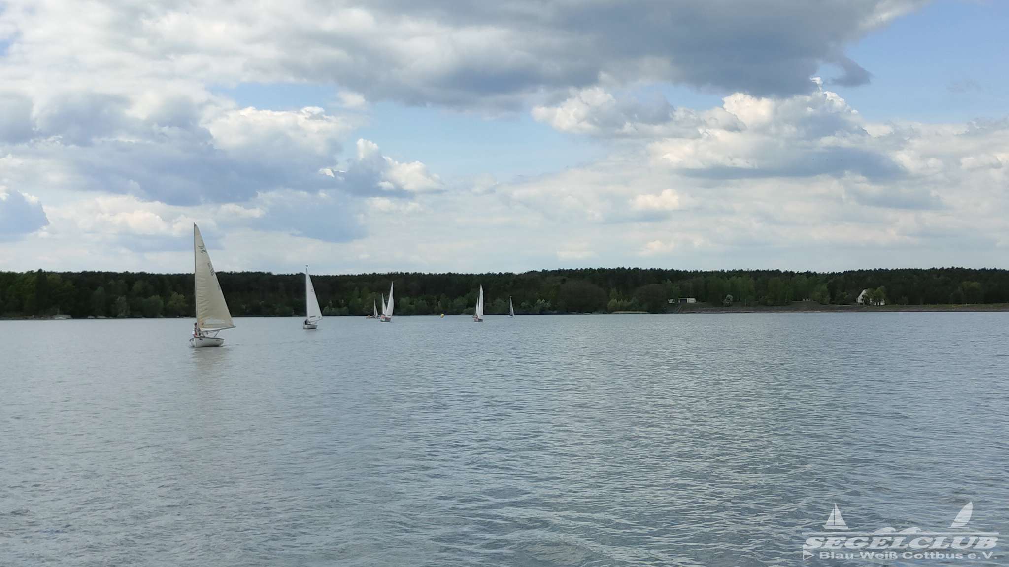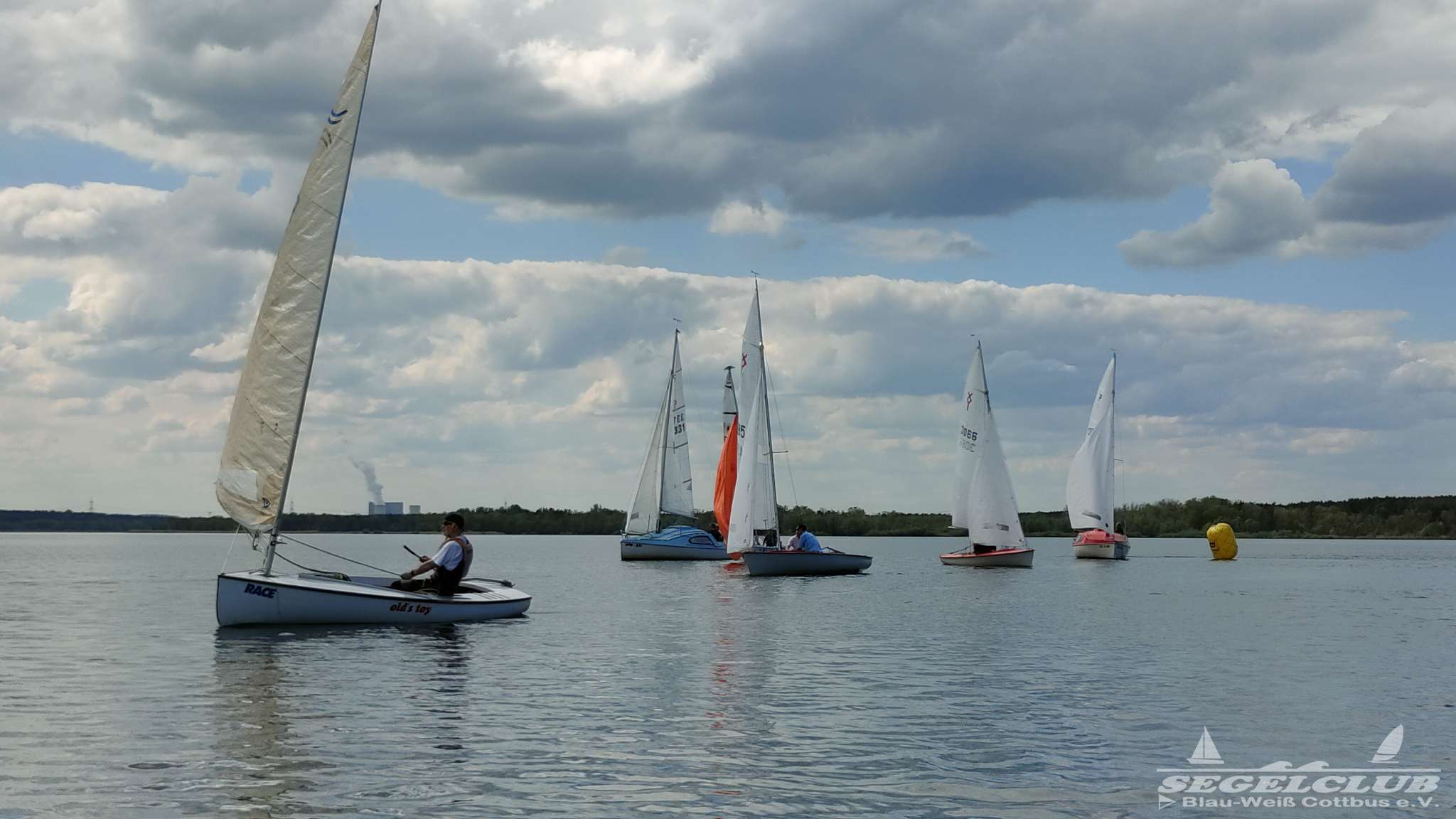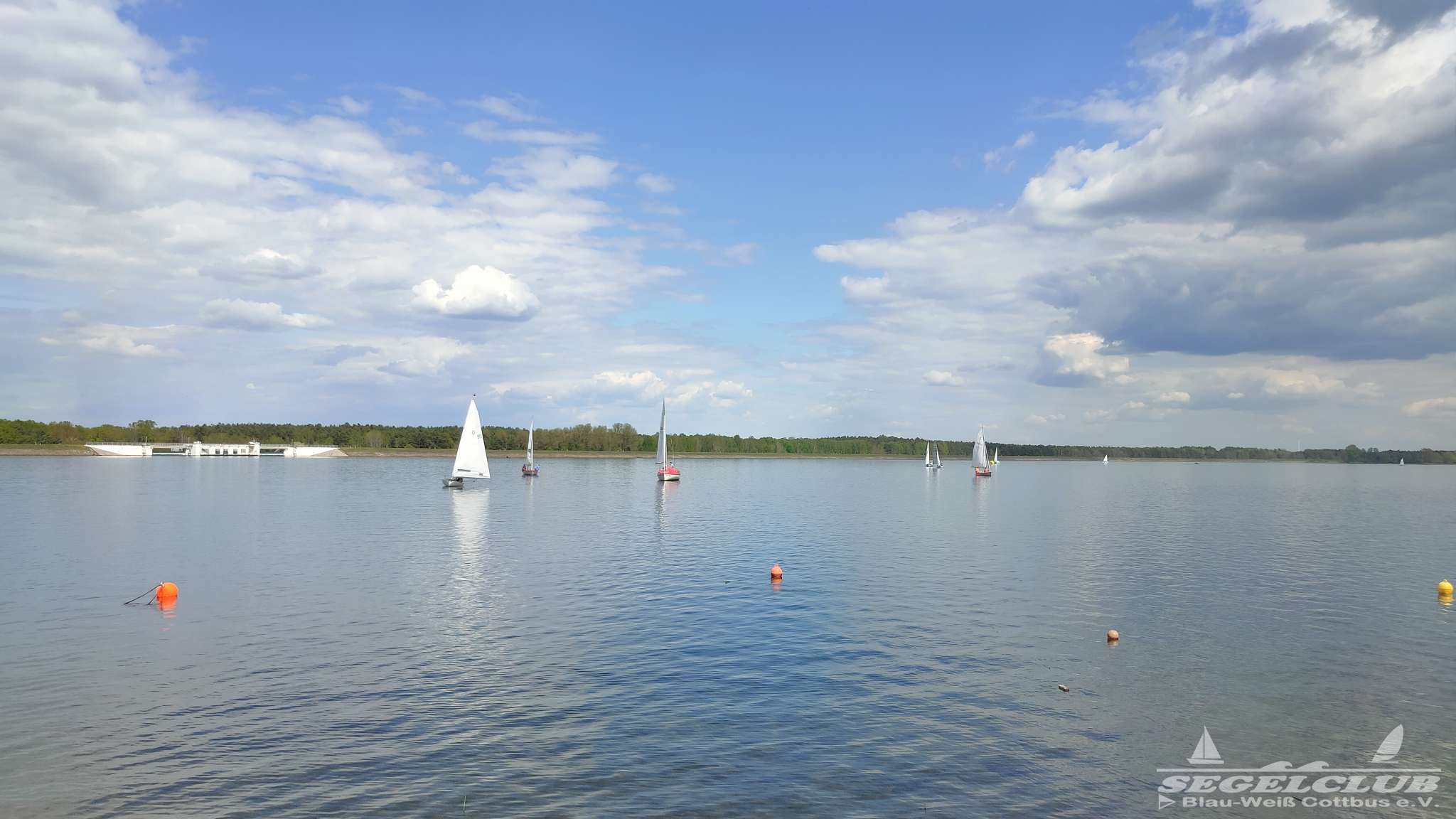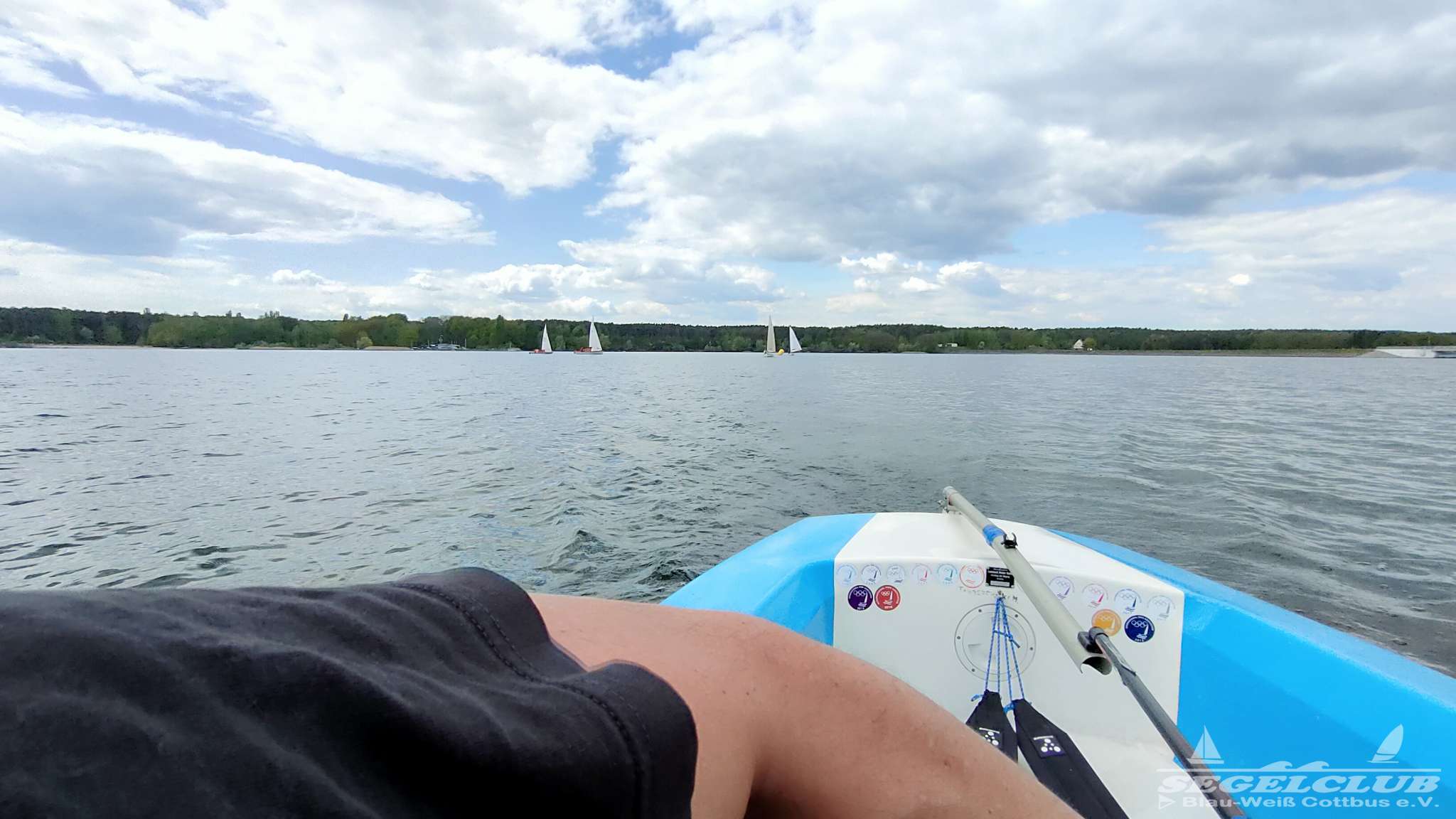 Um 10 Uhr legten wir einen Dreieckskurs auf dem See aus aus drei großen Tonnen (die gelben Bojen, gut auf den Fotos unten zu sehen). Normalerweise legt man einen Kurs so aus, dass man bei der ersten Strecke genau gegen den Wind fahren muss. Man muss dann kreuzen, also zickzack gegen den Wind. Das war diesmal gar nicht so einfach. Bei dem wenigen Wind, dreht dieser auch von einer Minute auf die andere. Deswegen war eine gute Kurslegung kaum möglich.