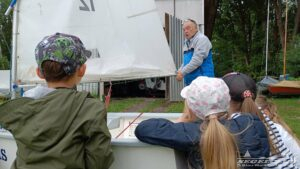 Nach der theoretischen Einführung ging es in die Praxis über. Jedes Kind nahm Platz auf einem bereitgestellten Opti-Boot und übte mit dem Steuer die richtige Sitzposition und Lenkbewegungen. Robert sorgte für den realistischen Effekt, indem er das Boot auf dem Wagen in die entsprechende Richtung drehte.