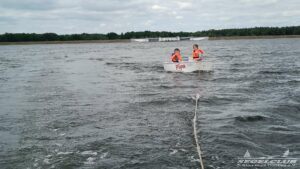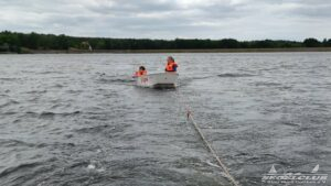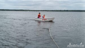 Nun wurde es spannend! Das Motorboot kam zum Einsatz und zog jeweils einen Opti mit einer Schleppleine. Dadurch konnten die Kinder sich ganz auf das Steuern konzentrieren und einen direkten Zusammenhang zwischen ihren Steuerbewegungen und der Richtungsänderung des Bootes herstellen. Minute für Minute erlebten sie zahlreiche Aha-Momente. Dabei achteten sie auch auf die typische Seglerhaltung, ganz vorn am Mittelschott des Bootes.