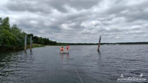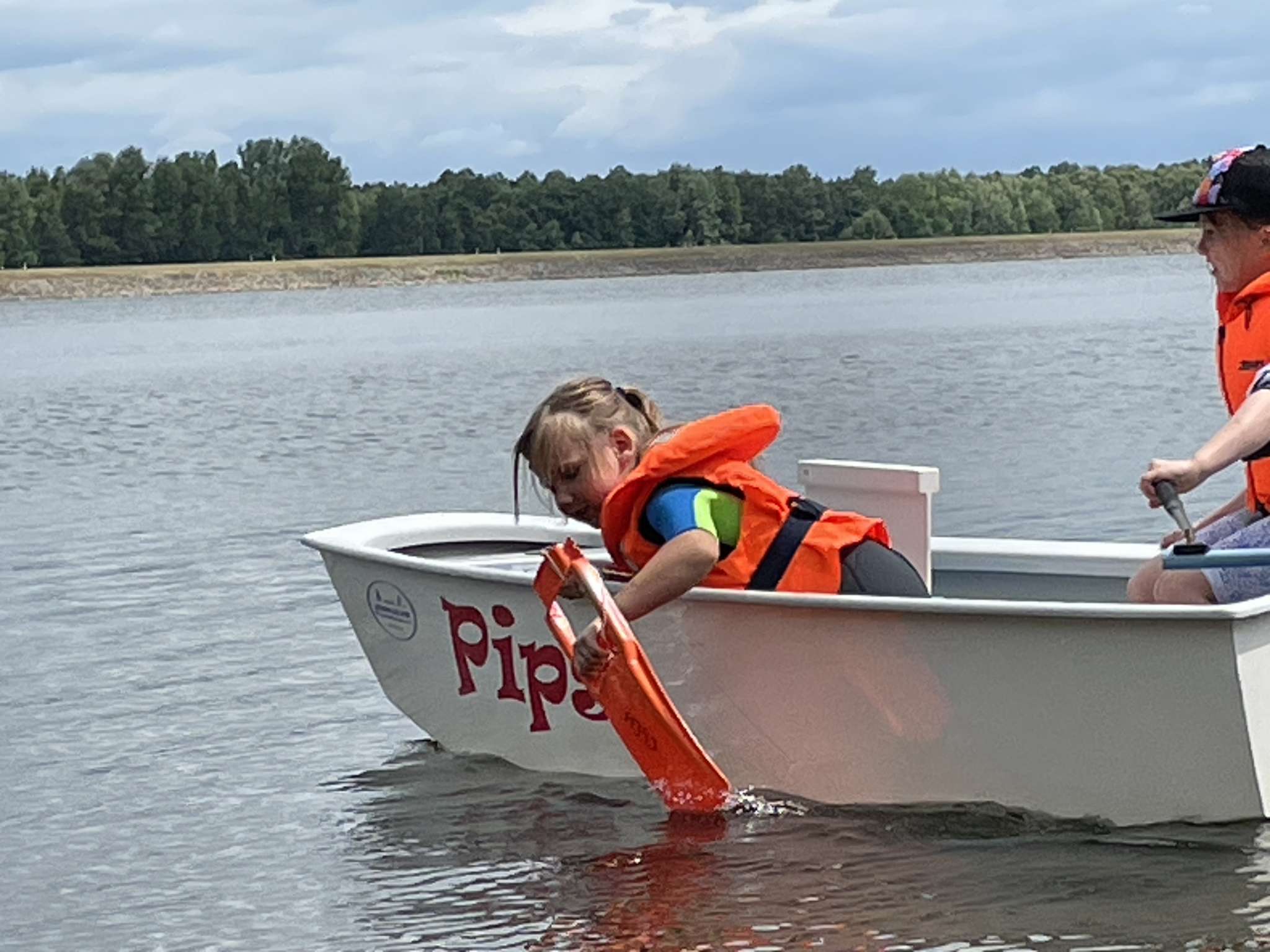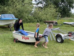 Nun war es Zeit, die Boote ins Wasser zu lassen. Die frisch getauften Boote vom letzten Trainingslager waren nun heiß begehrt, und jedes Kind konnte sein Lieblingsboot an Hand seines Namens auswählen. Zum Einsatz kamen diesmal Stella Maris, Elli, PhiliMax und Willi. Robert erklärte den Kindern die ersten drei Steuerbewegungen: Mittelstellung, Kurs nach Lee (Ruder heranziehen) und Kurs nach Luv (Ruder wegdrücken). Da es für viele das erste Mal war, beließen wir es vorerst bei den Kommandos „Steuer heranziehen“ und „Steuer wegdrücken“. Im Wasser paddelte nun ein Kind mit dem „Praddel“, einer Art Paddel, um Fahrt zu machen, während das Partnerkind im gleichen Boot die Steuerbewegungen auf Anweisung von Robert umsetzte. Dadurch bewegte sich nun ein eigenständiges Boot mit zwei Kindern schon in einem begrenzten Bereich vor dem Hafen.