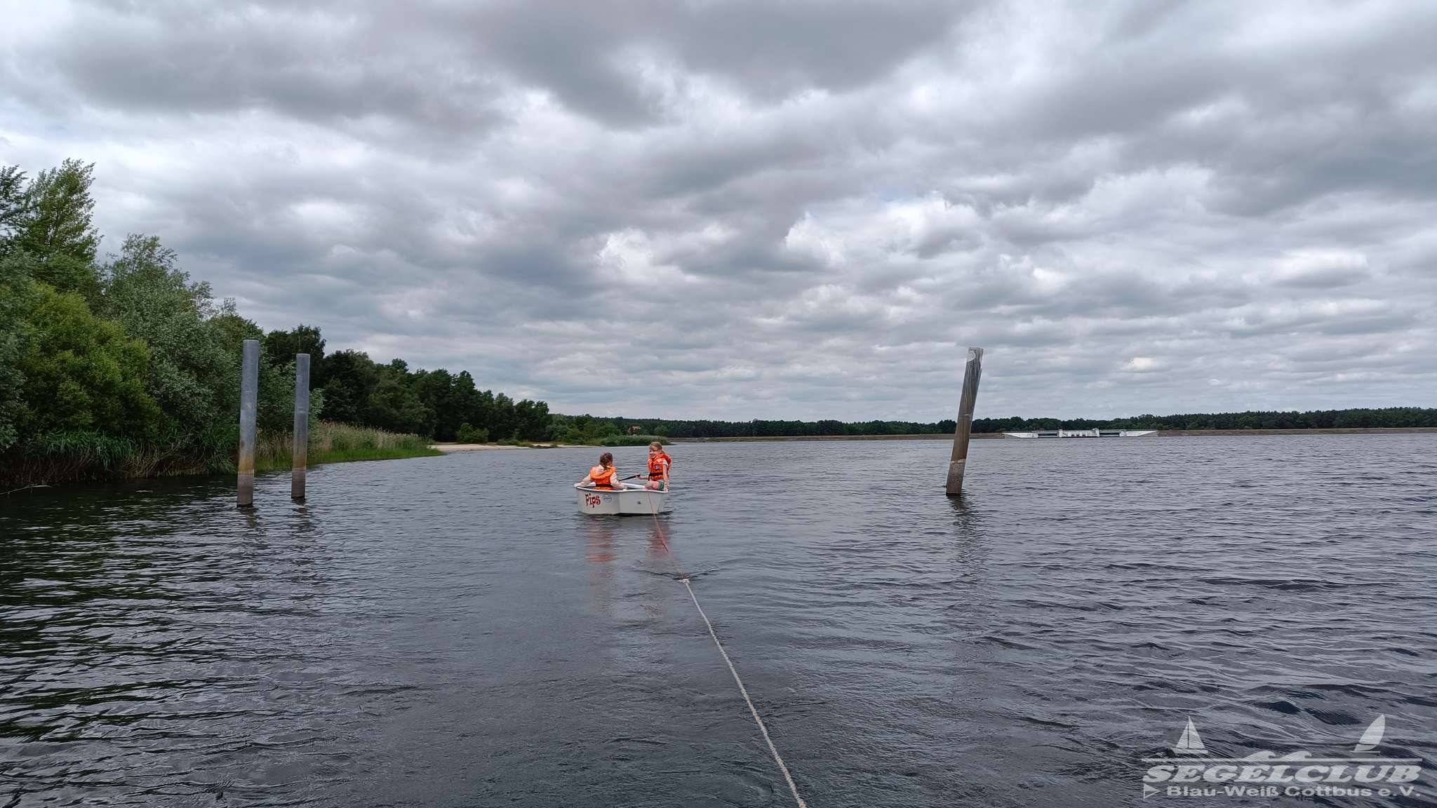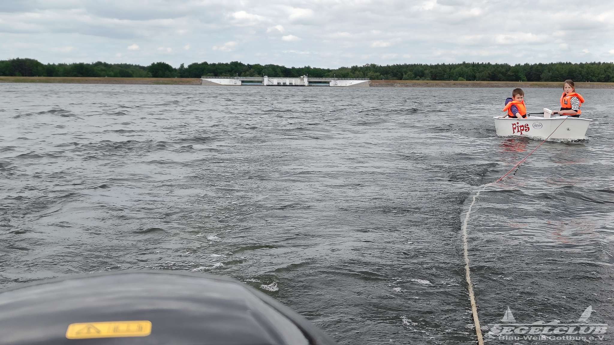 Nun wurde es spannend! Das Motorboot kam zum Einsatz und zog jeweils einen Opti mit einer Schleppleine. Dadurch konnten die Kinder sich ganz auf das Steuern konzentrieren und einen direkten Zusammenhang zwischen ihren Steuerbewegungen und der Richtungsänderung des Bootes herstellen. Minute für Minute erlebten sie zahlreiche Aha-Momente. Dabei achteten sie auch auf die typische Seglerhaltung, ganz vorn am Mittelschott des Bootes.