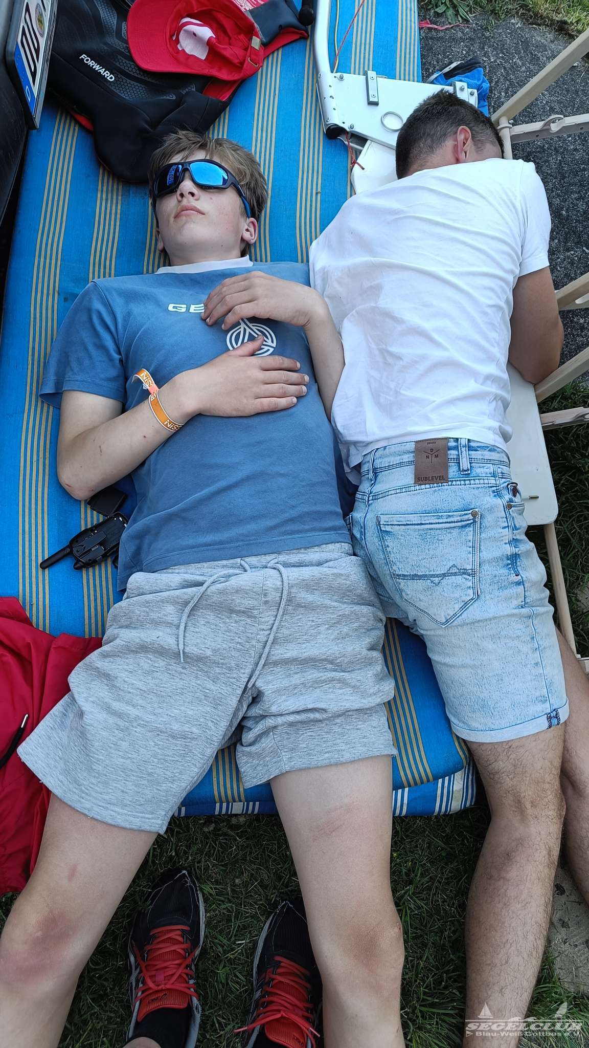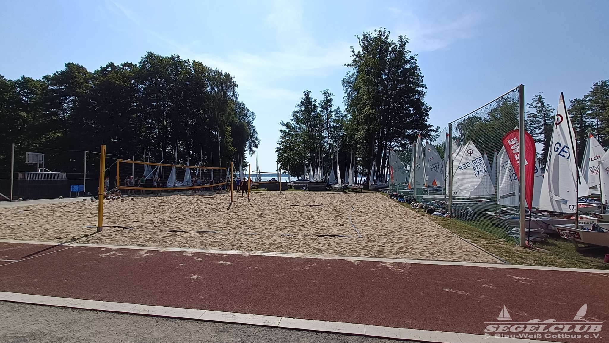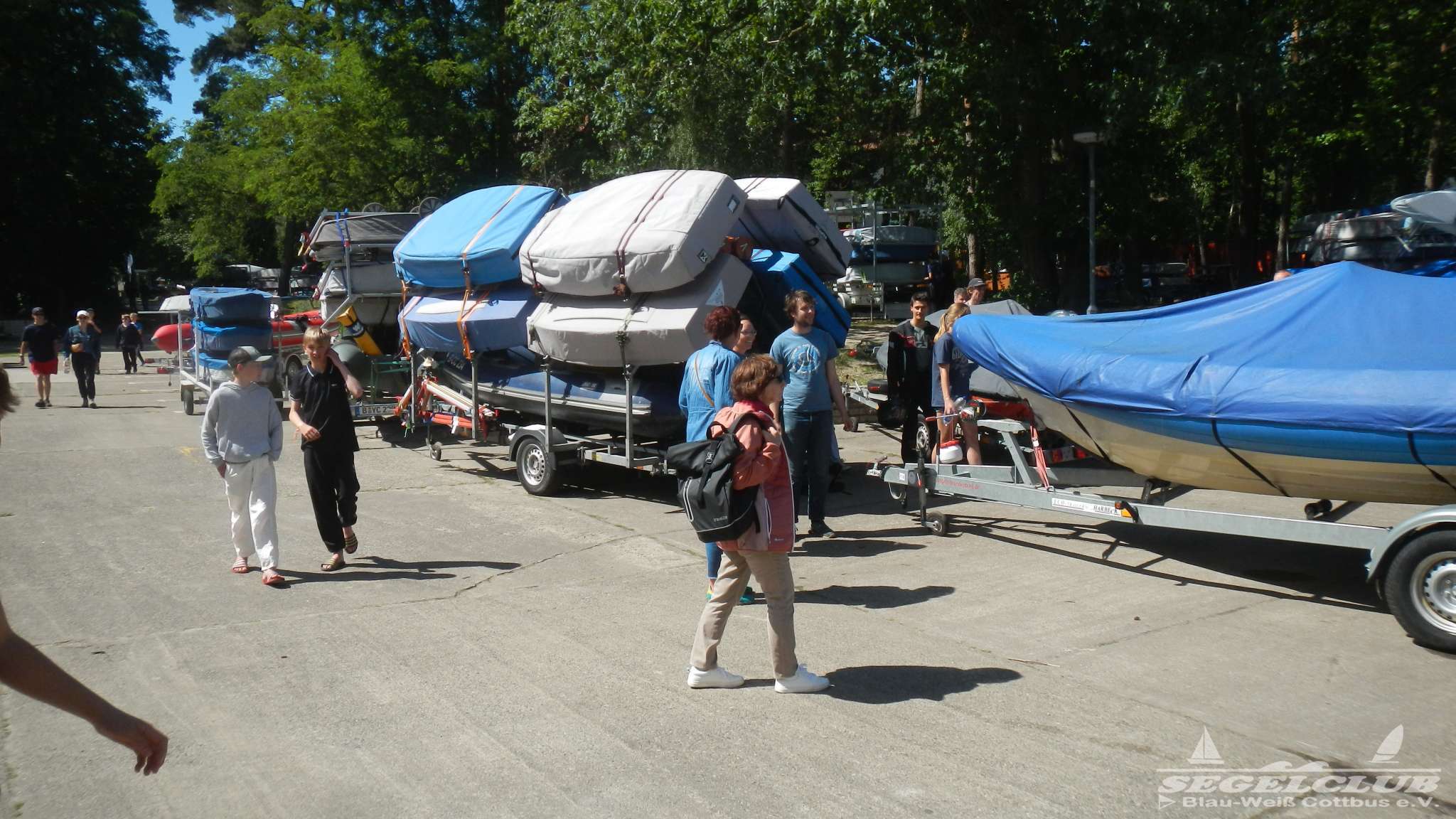 Dort angekommen erwartete uns eine hoch durchorganisierte Atmosphäre. Wirklich hunderte von jugendlichen Seglern, Kindern, Betreuern und Sicherheitskräften wuselten um viel zu eng geparkte Boote umher. Wir bekamen ein lauschiges Plätzchen am Rand für unsere Busse, in welchen wir als Betreuer unterkamen und begannen dann mit dem Abräumen der Boote. Das Gelände dort war einfach toll. Man hatte einen riesen betonierten Platz auf welchem man in aller Ruhe ohne im Staub und Dreck umzutrampeln aufbauen konnte. Die Optisegel konnten aufgebaut in einer großen Halle untergebracht werden. Die Kinder und Jugendlichen bauten ihre Zelte auf.