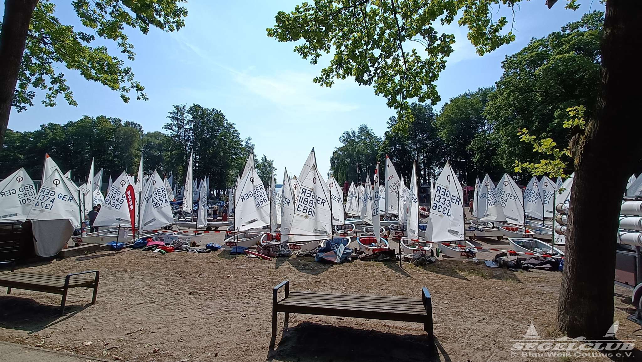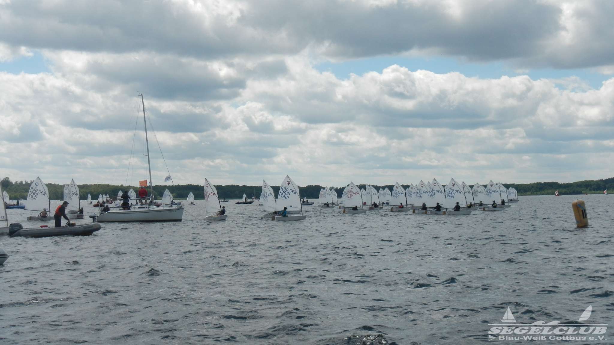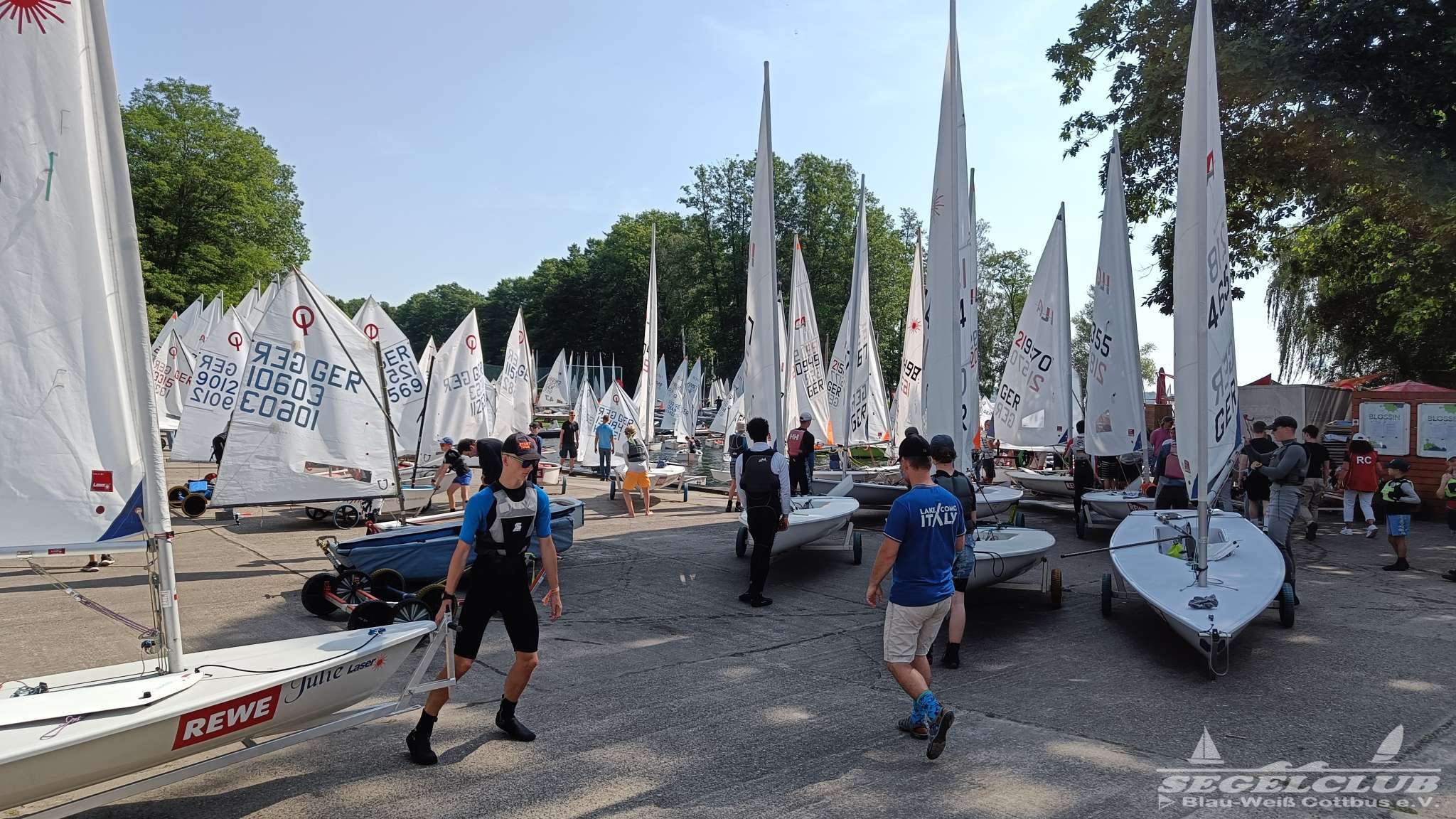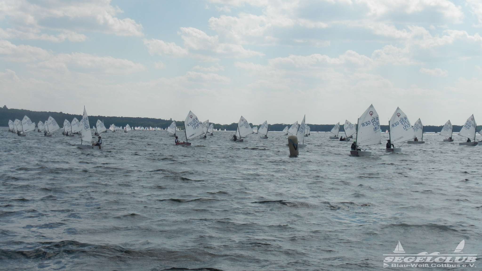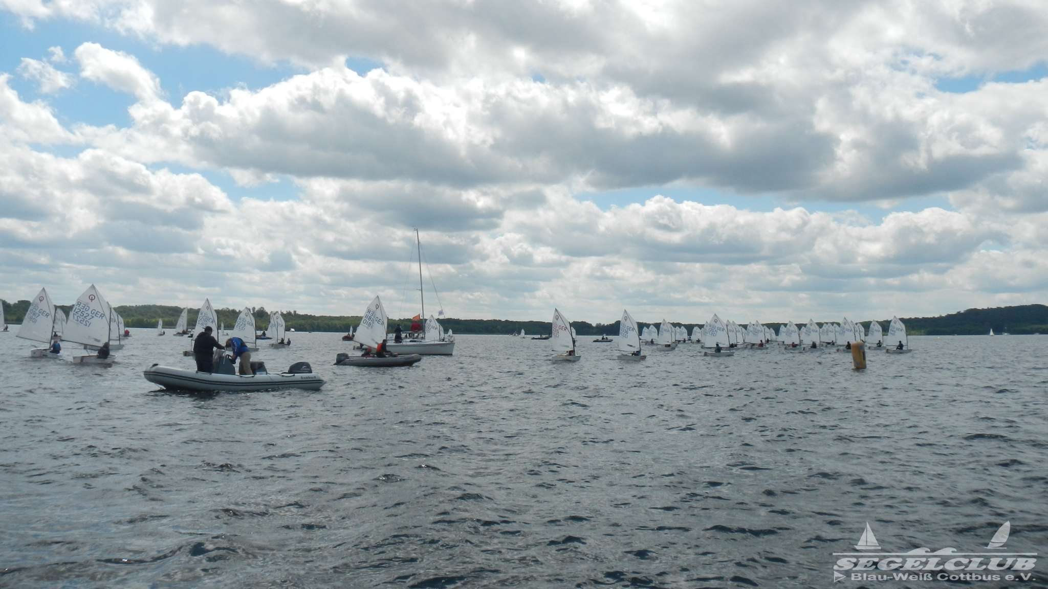 Unsere ILCA Jungs waren guter Dinge und so konnte die Regatta starten. Bei den Optis, die in einem anderen Feld und auch anderem Bereich des See starteten, sah es noch krasser aus. Das Opti Feld mit 92 OptiA und 68 OptiB Startern war einfach riesig für jemanden aus unserer Region. Sicher gibt es bestimmt noch größere Felder, aber das war schon eine Hausnummer.