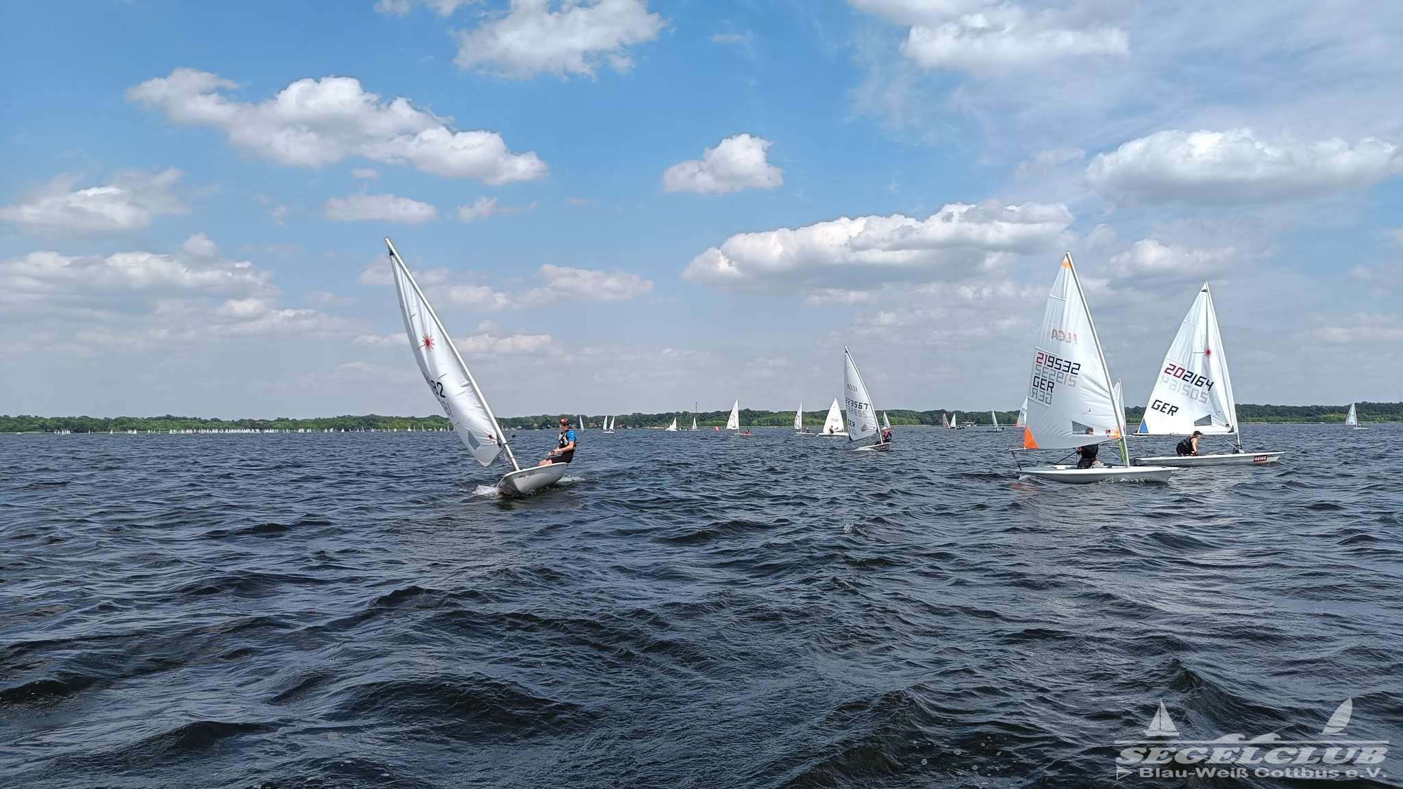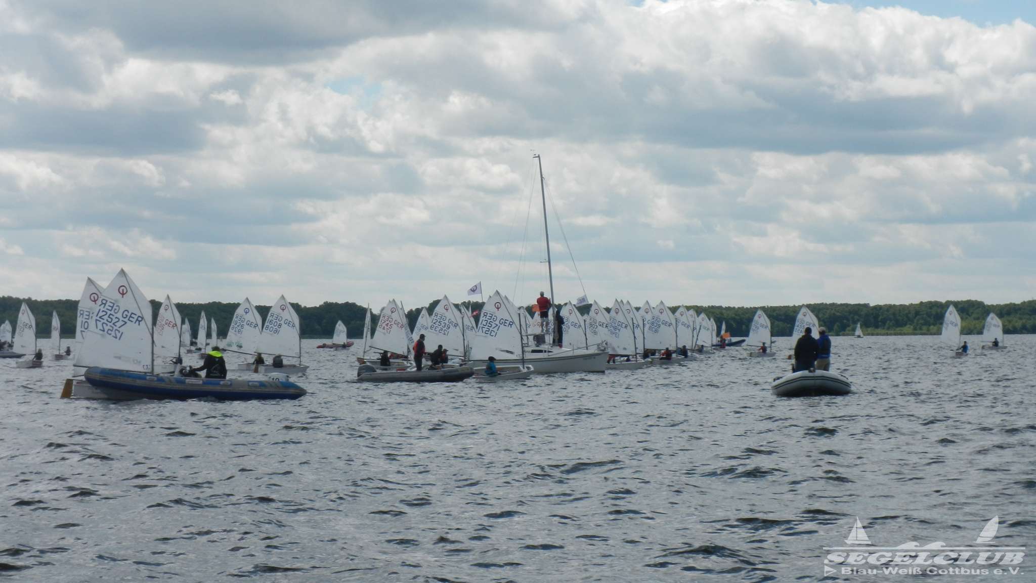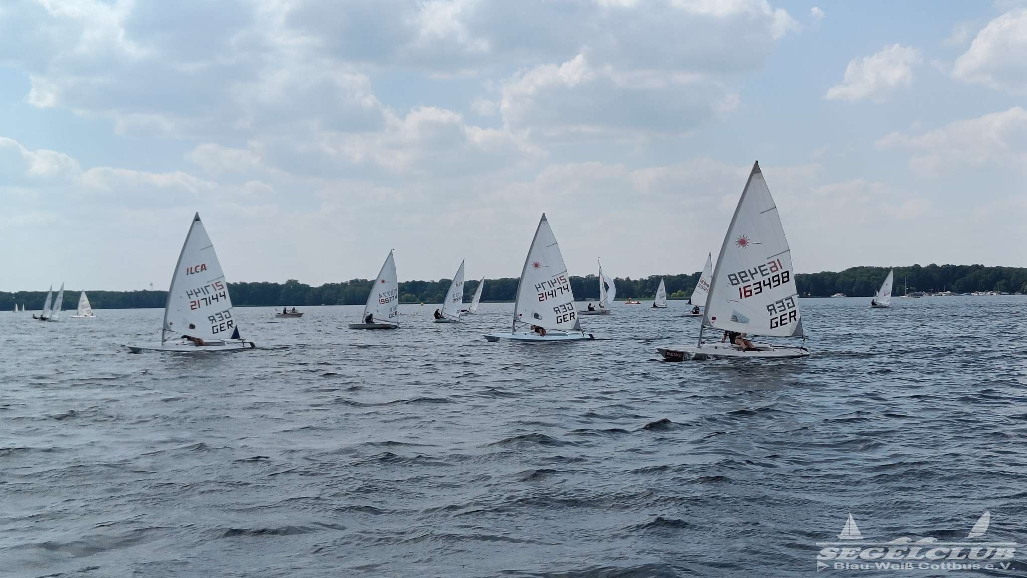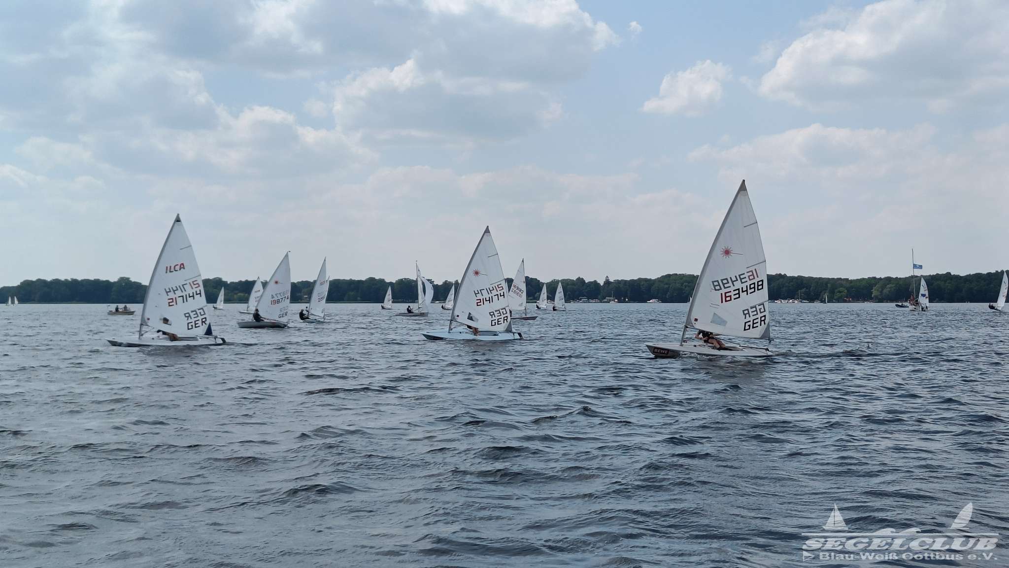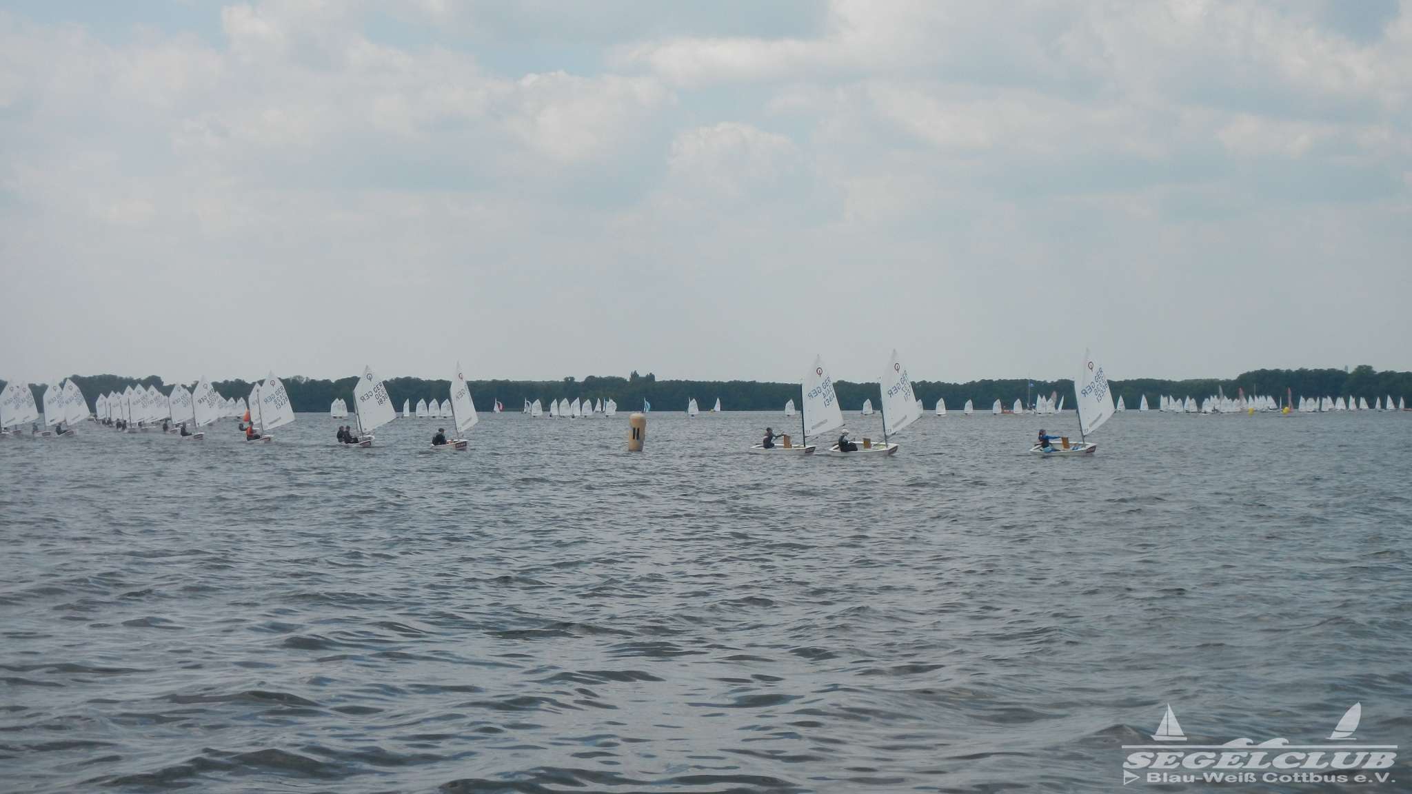 Unsere ILCA Jungs waren guter Dinge und so konnte die Regatta starten. Bei den Optis, die in einem anderen Feld und auch anderem Bereich des See starteten, sah es noch krasser aus. Das Opti Feld mit 92 OptiA und 68 OptiB Startern war einfach riesig für jemanden aus unserer Region. Sicher gibt es bestimmt noch größere Felder, aber das war schon eine Hausnummer.