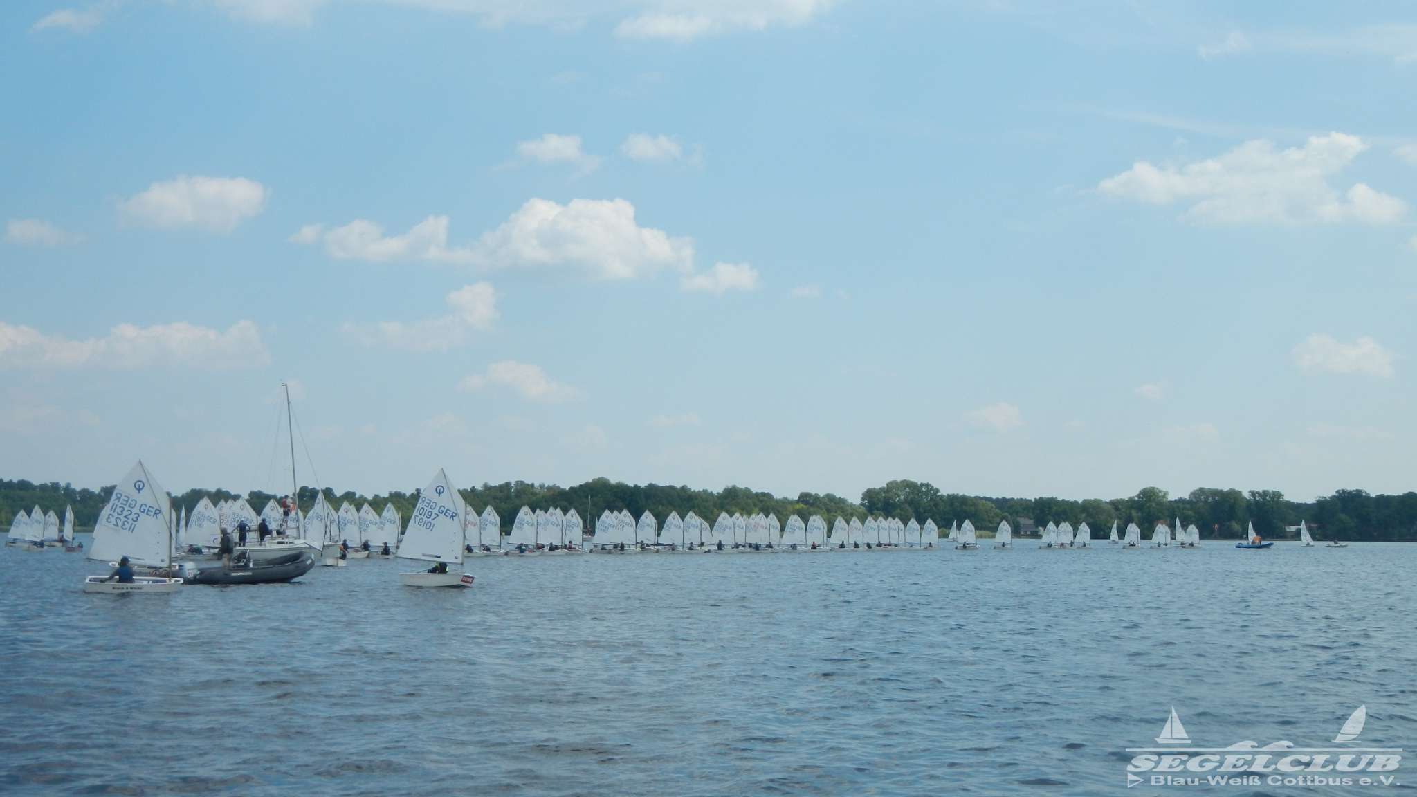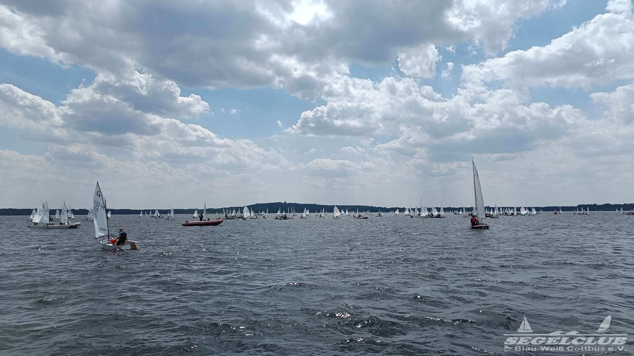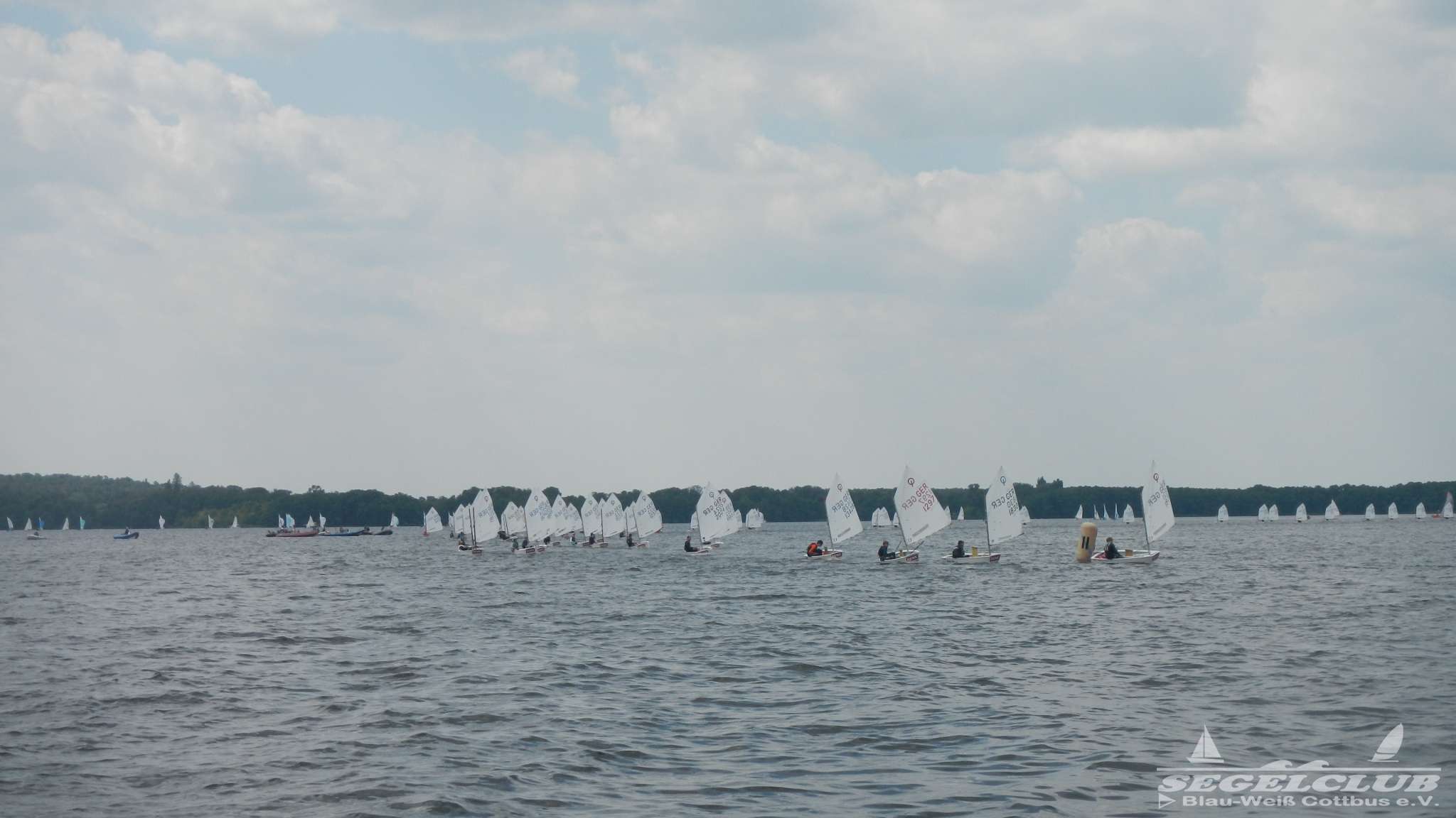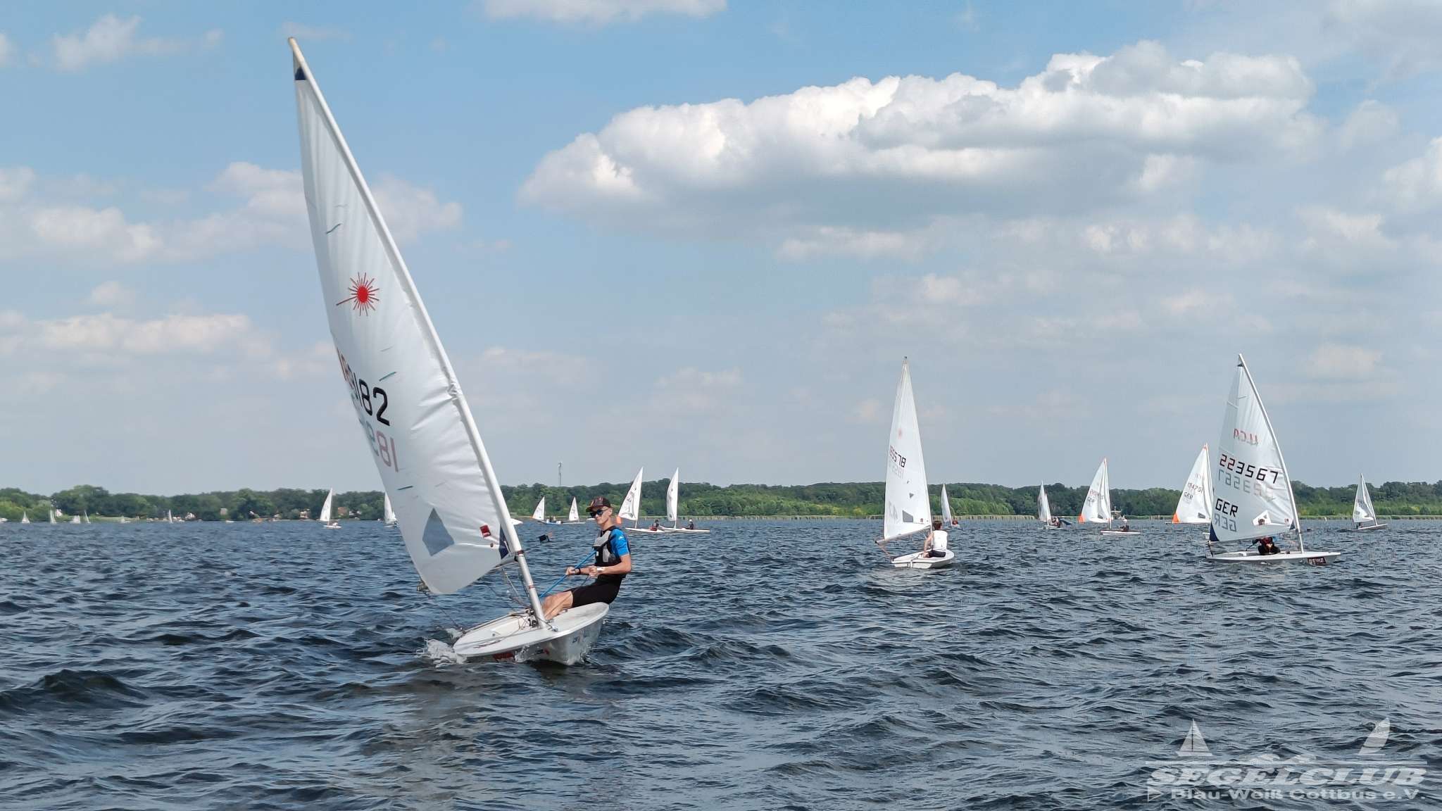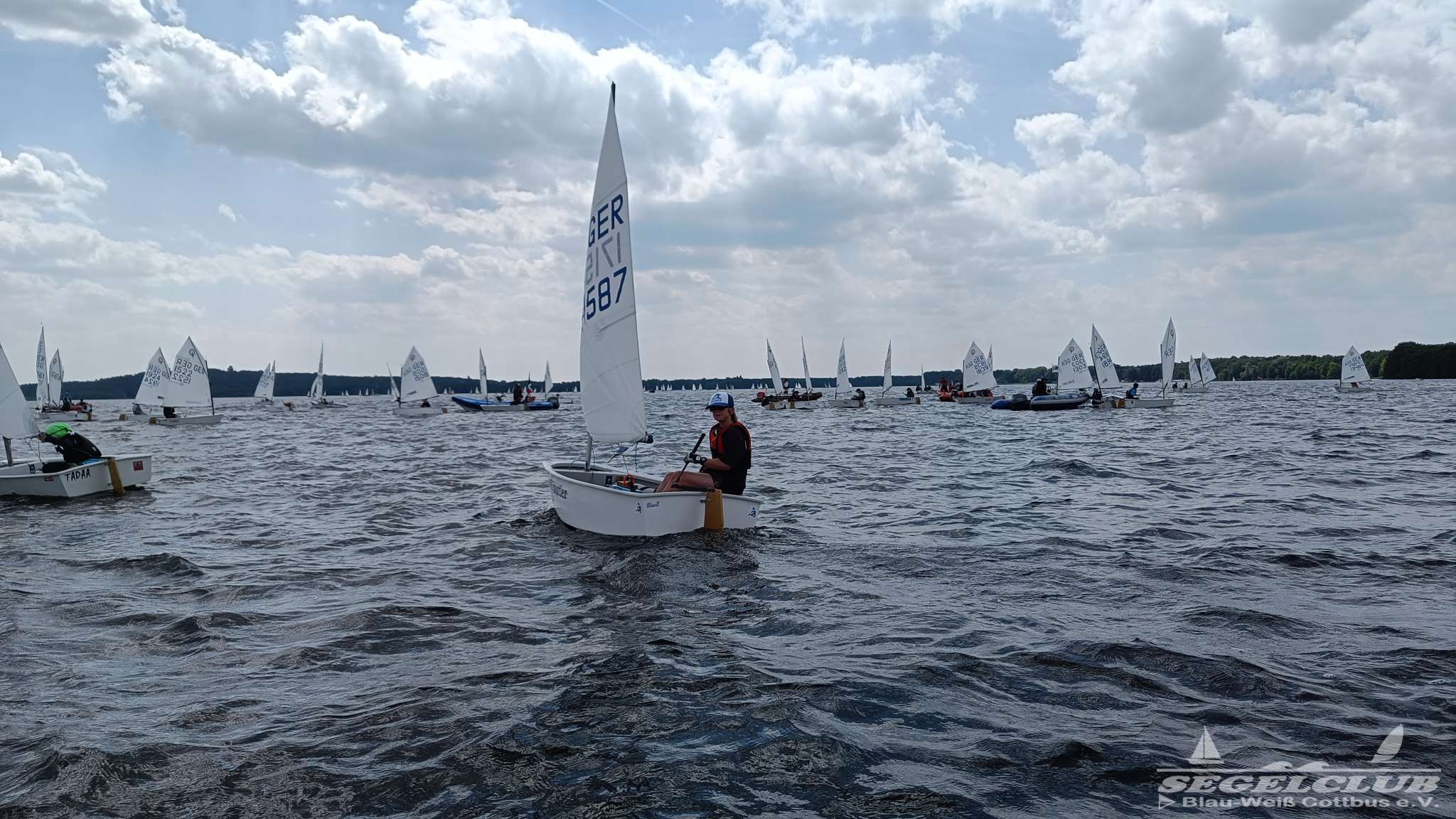 Unsere ILCA Jungs waren guter Dinge und so konnte die Regatta starten. Bei den Optis, die in einem anderen Feld und auch anderem Bereich des See starteten, sah es noch krasser aus. Das Opti Feld mit 92 OptiA und 68 OptiB Startern war einfach riesig für jemanden aus unserer Region. Sicher gibt es bestimmt noch größere Felder, aber das war schon eine Hausnummer.