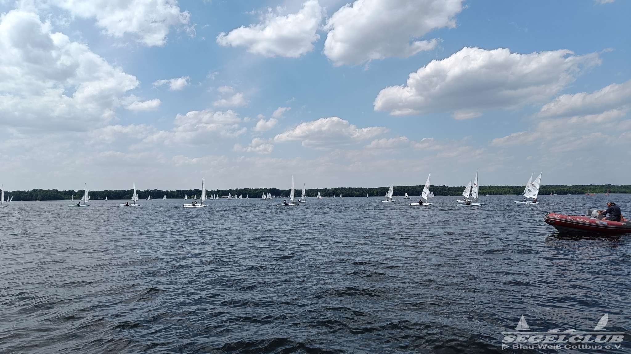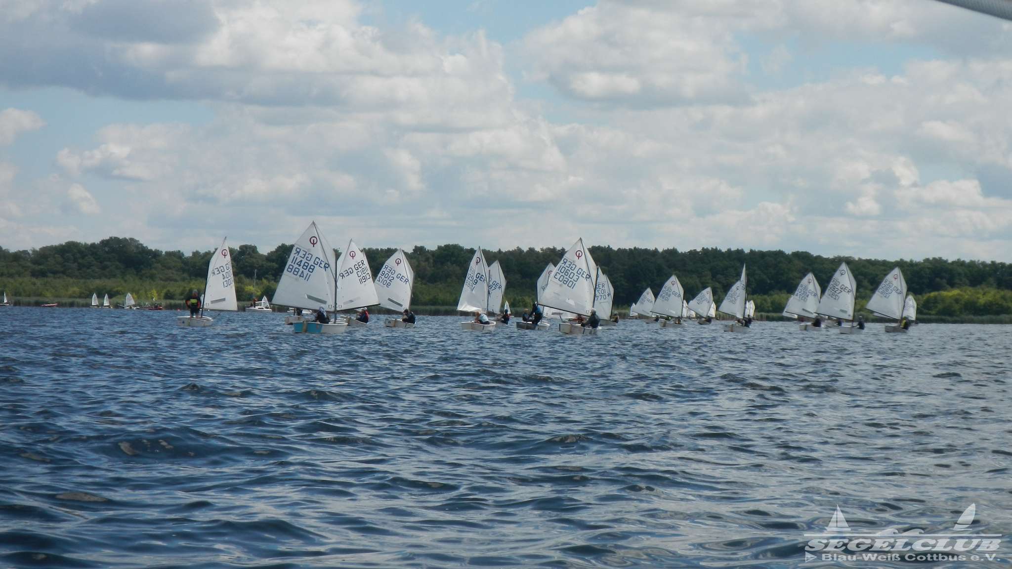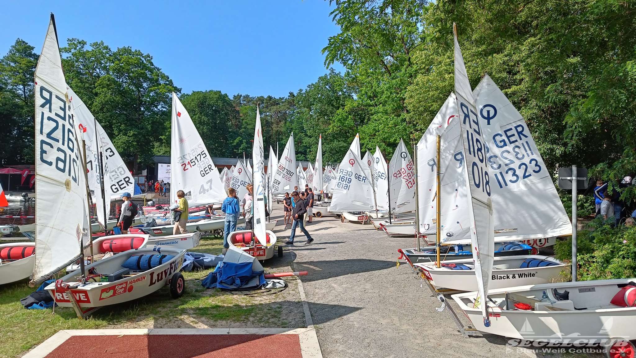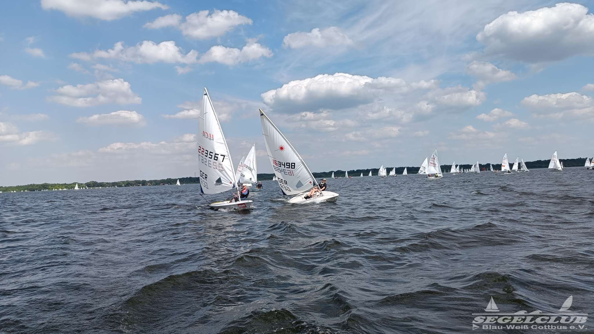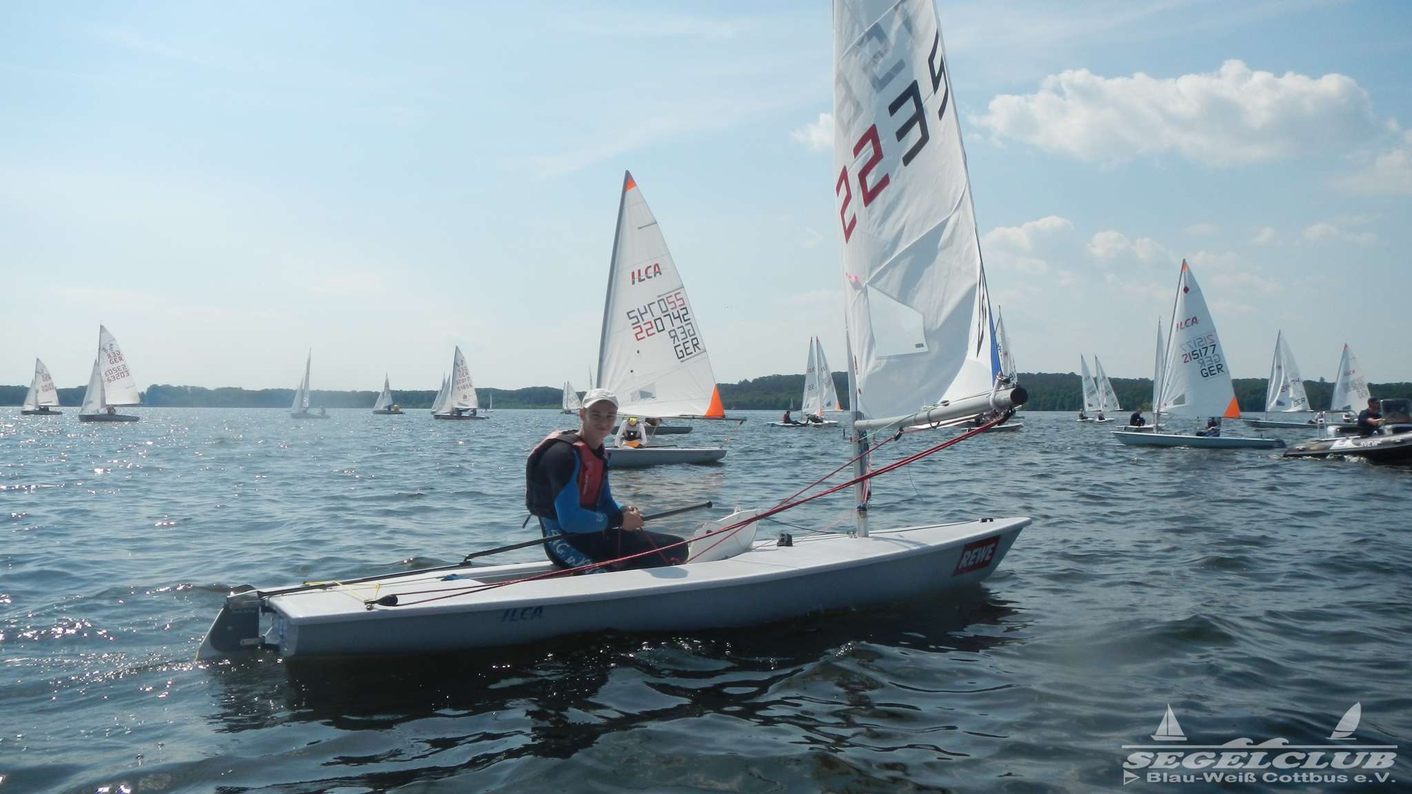 Unsere ILCA Jungs waren guter Dinge und so konnte die Regatta starten. Bei den Optis, die in einem anderen Feld und auch anderem Bereich des See starteten, sah es noch krasser aus. Das Opti Feld mit 92 OptiA und 68 OptiB Startern war einfach riesig für jemanden aus unserer Region. Sicher gibt es bestimmt noch größere Felder, aber das war schon eine Hausnummer.