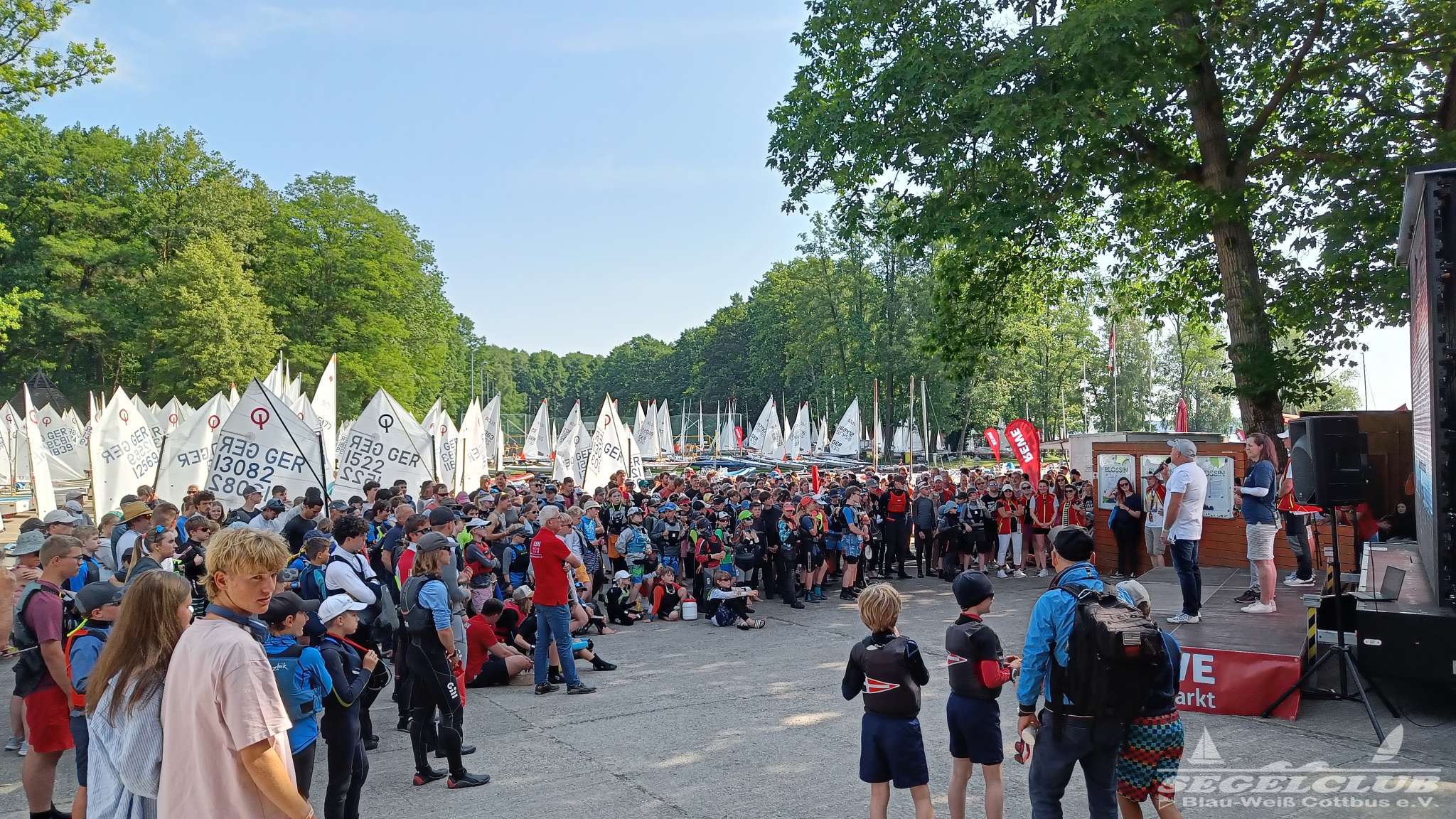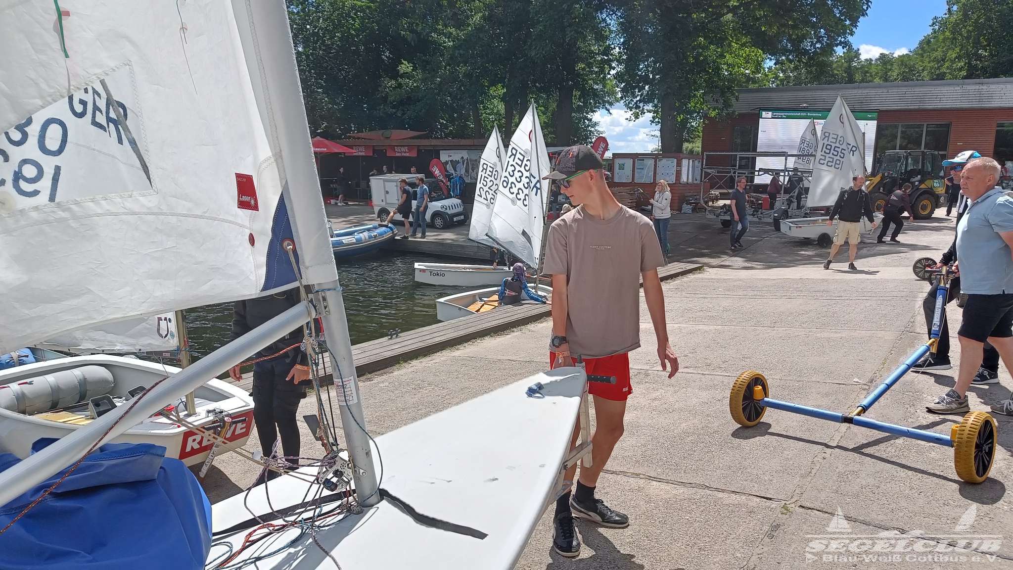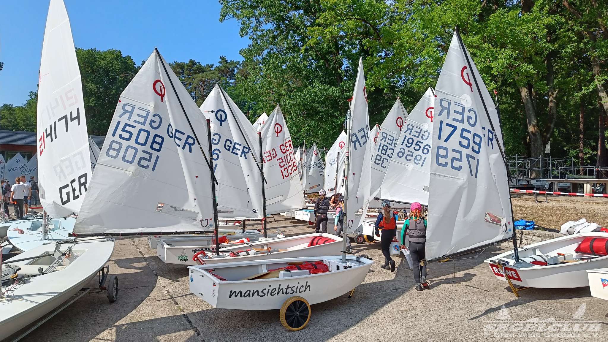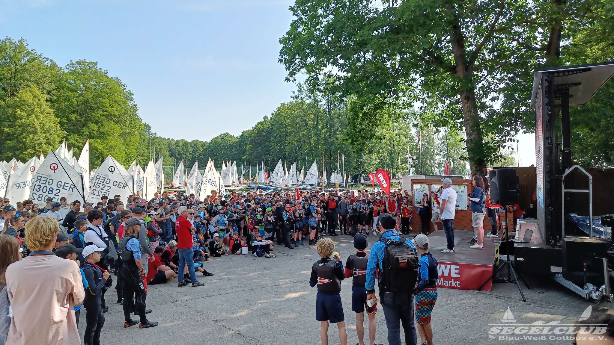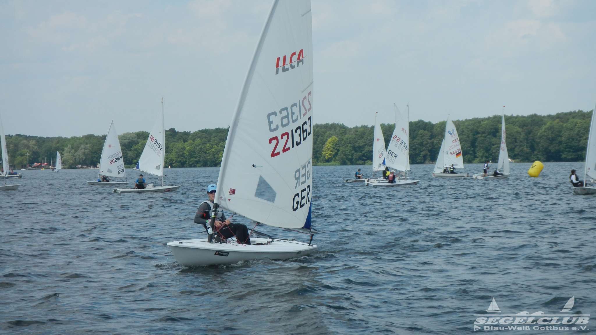Unsere ILCA Jungs waren guter Dinge und so konnte die Regatta starten. Bei den Optis, die in einem anderen Feld und auch anderem Bereich des See starteten, sah es noch krasser aus. Das Opti Feld mit 92 OptiA und 68 OptiB Startern war einfach riesig für jemanden aus unserer Region. Sicher gibt es bestimmt noch größere Felder, aber das war schon eine Hausnummer.