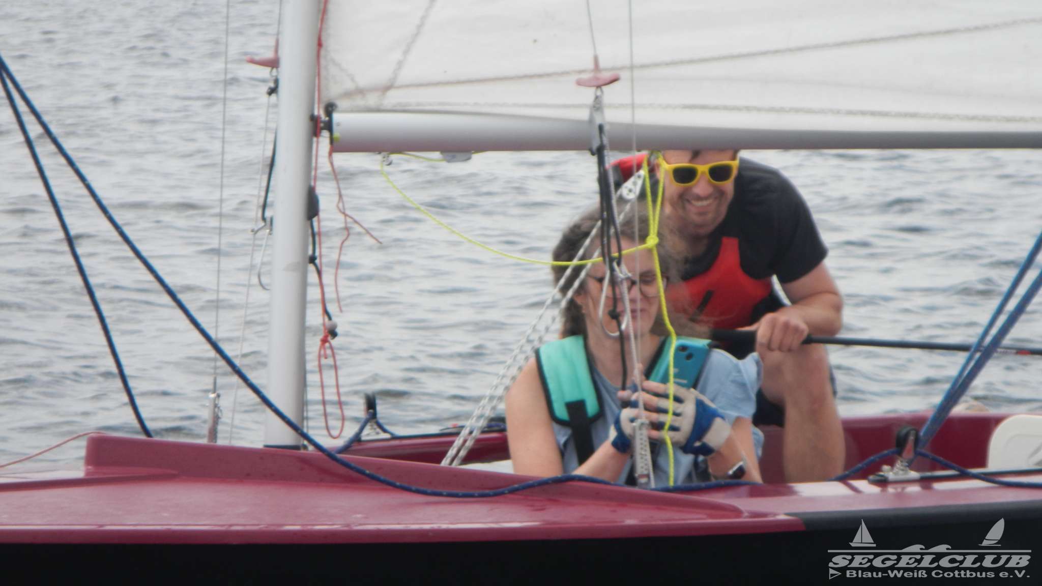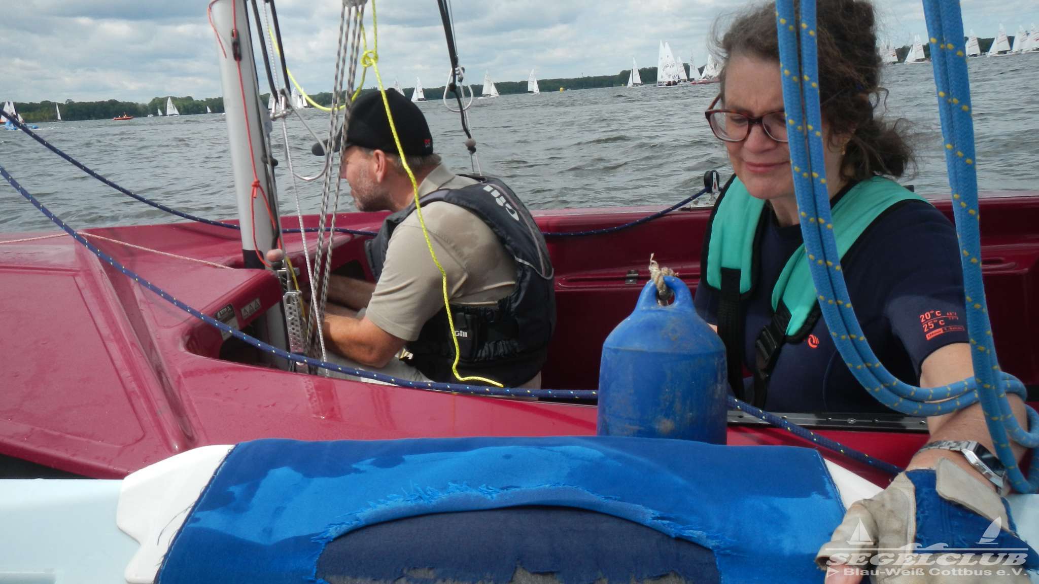 Pia und Oskar kamen mit der Situation gut zurecht und fuhren den Kurs nahezu erfolgreich ab. Pia verpasste den ersten Zieleinlauf im Gedrängel auf dem See. Ich war sehr stolz das das so gut klappte und der kleine Patzer kam dann auch nicht mehr vor. Aus meiner Erfahrung darf man das erste mal auf solch einer Regatta auch nicht erwarten vorn mitzusegeln. Man bekommt erst mal einen derben Dämpfer. Den muss man abkönnen und wieder angreifen. Unsere Platzierungen waren bei den ersten Wettfahrten also 48 von 68 und DNC (hier durch kein Zieldurchgang).