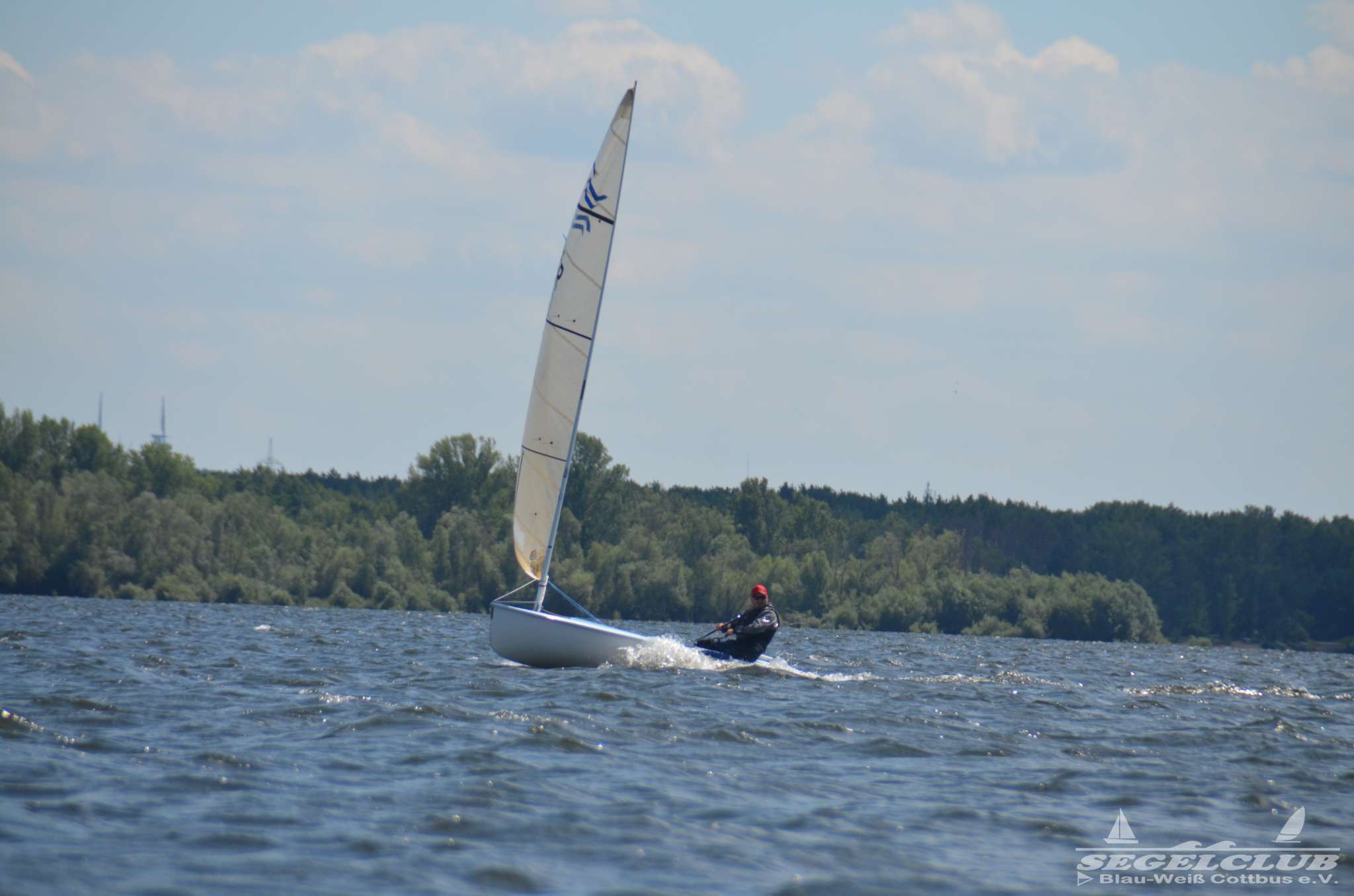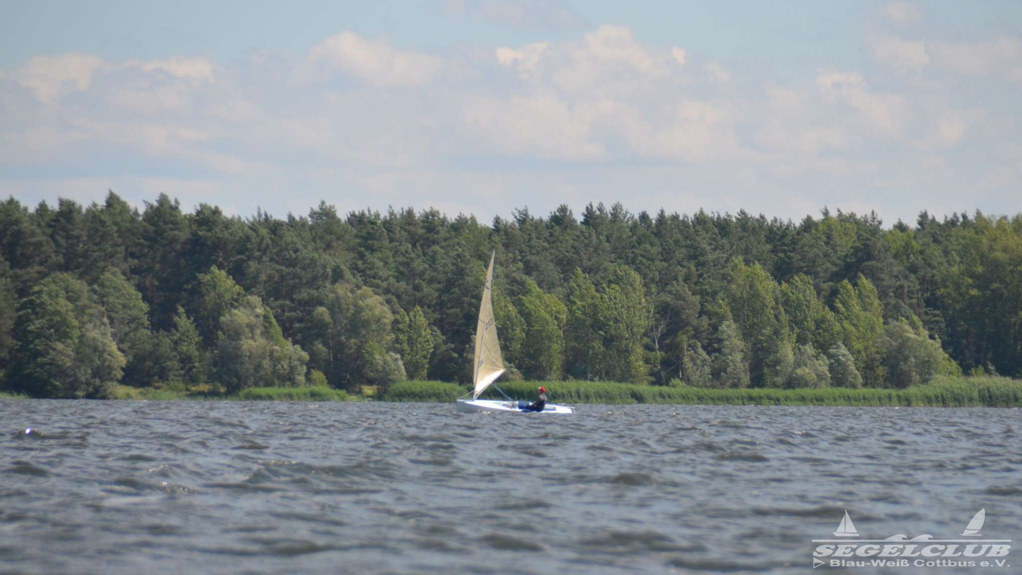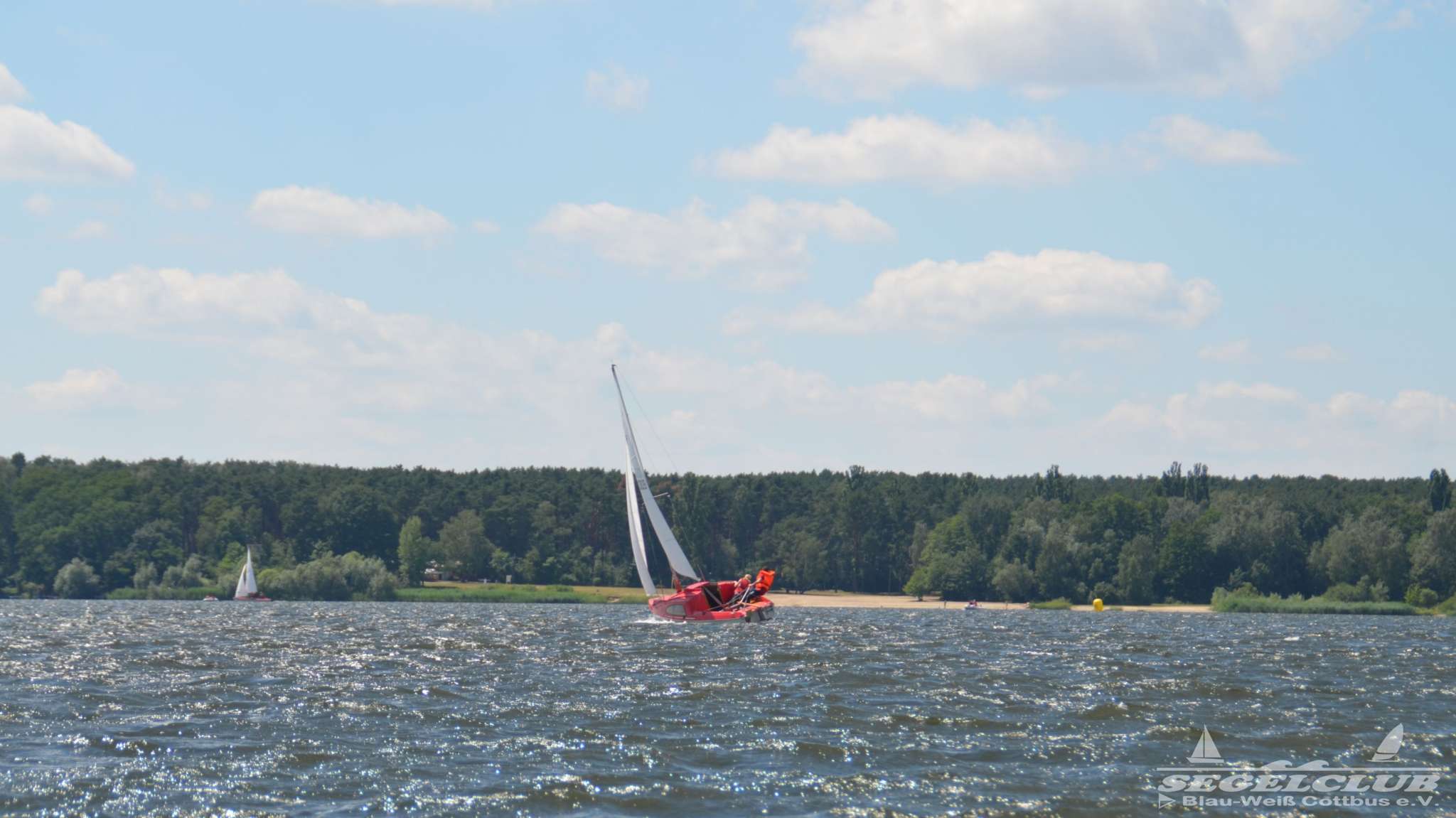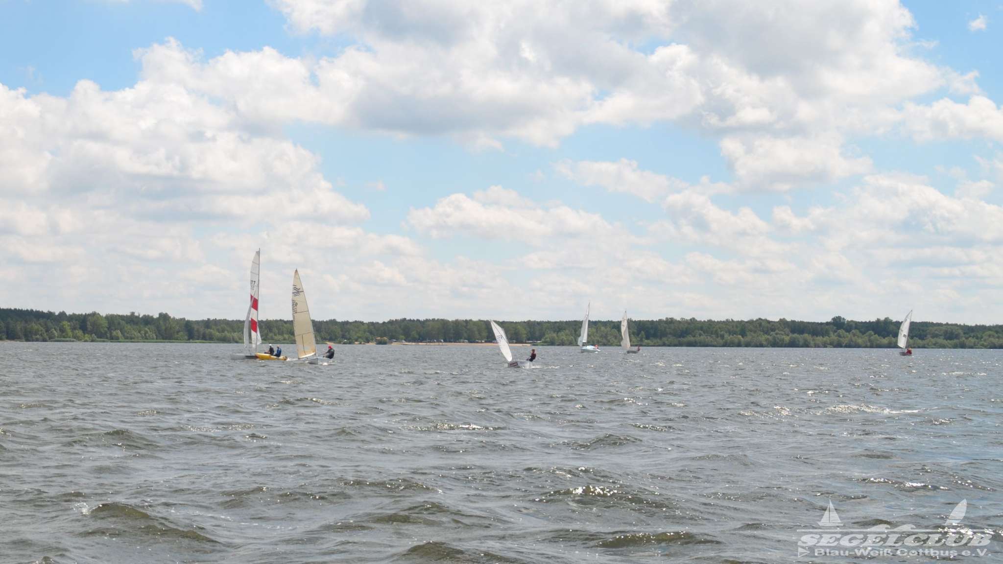 Zunächst ein paar Sätze zur Langstreckenregatta. Die Sommersonnenwende Ausfahrt wird in einem seperaten Beitrag behandelt. Bekanntermaßen wird nur eine Wettfahrt gesegelt, welche dafür aber wie der Name schon sagt eine recht lange ist. Wir hatten ordentlich Wind so das auf der Kreuz eigentlich dauerhaftes Ausreiten bzw. Trapez gestütztes Fahren angesagt war. Der Kurs hat mir persönlich sehr gut gefallen, es wurden drei wirklich große Dreiecke gefahren. Wobei die Schläge von Tonne 1 zu 2 und von Tonne 2 zu 3 richtig richtig lang waren. Das sind die Raumschläge, hier konnte man schön mit dem Wind arbeiten und bei Wind-schwachen Stellen luven und bei einsetzenden Böen dann abfallen und mit voll Speed los rocken. Die Kreuz war sehr gut ausbalanciert und dank der klaren Winddreher konnte man taktisch viel machen.