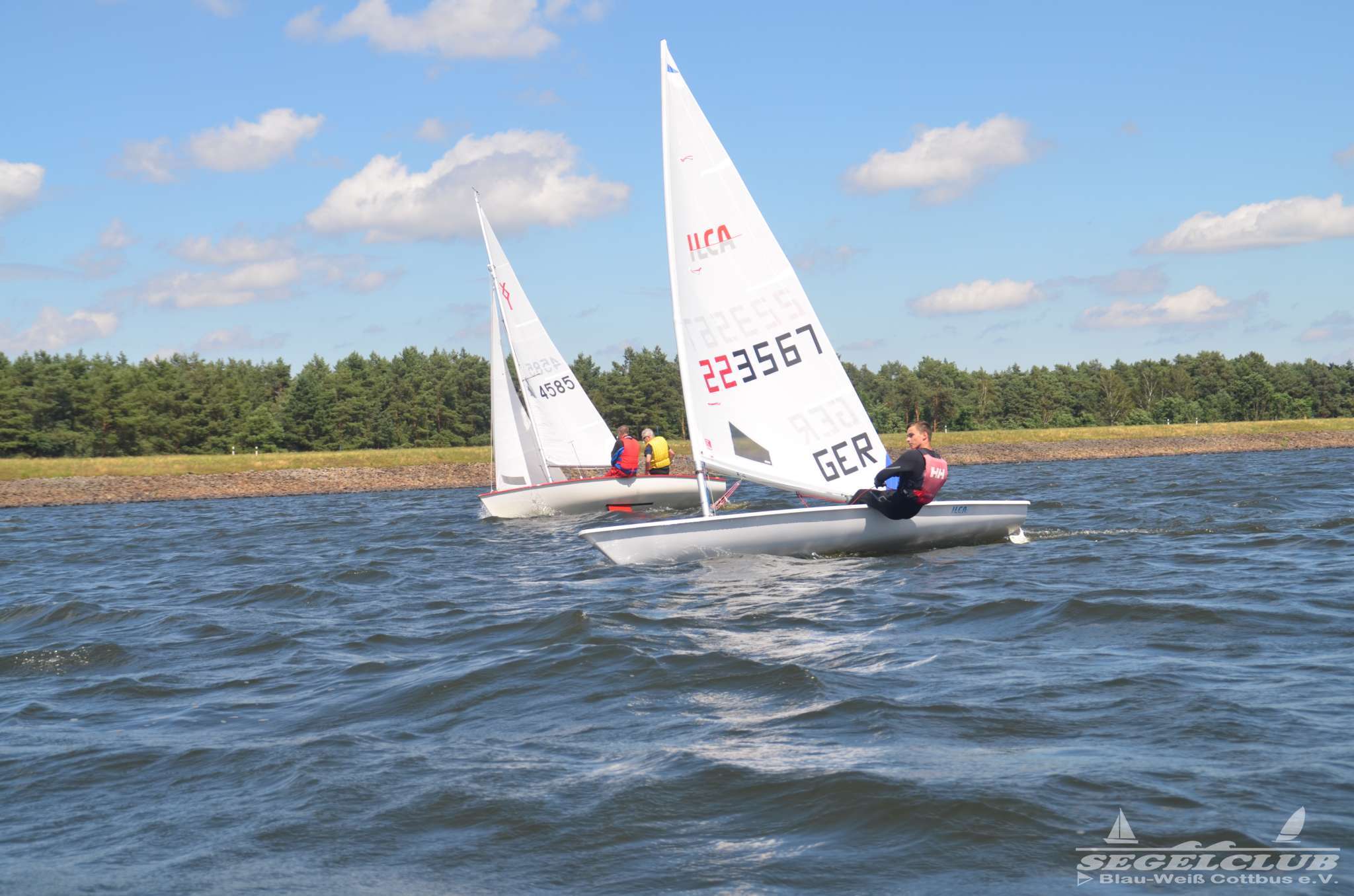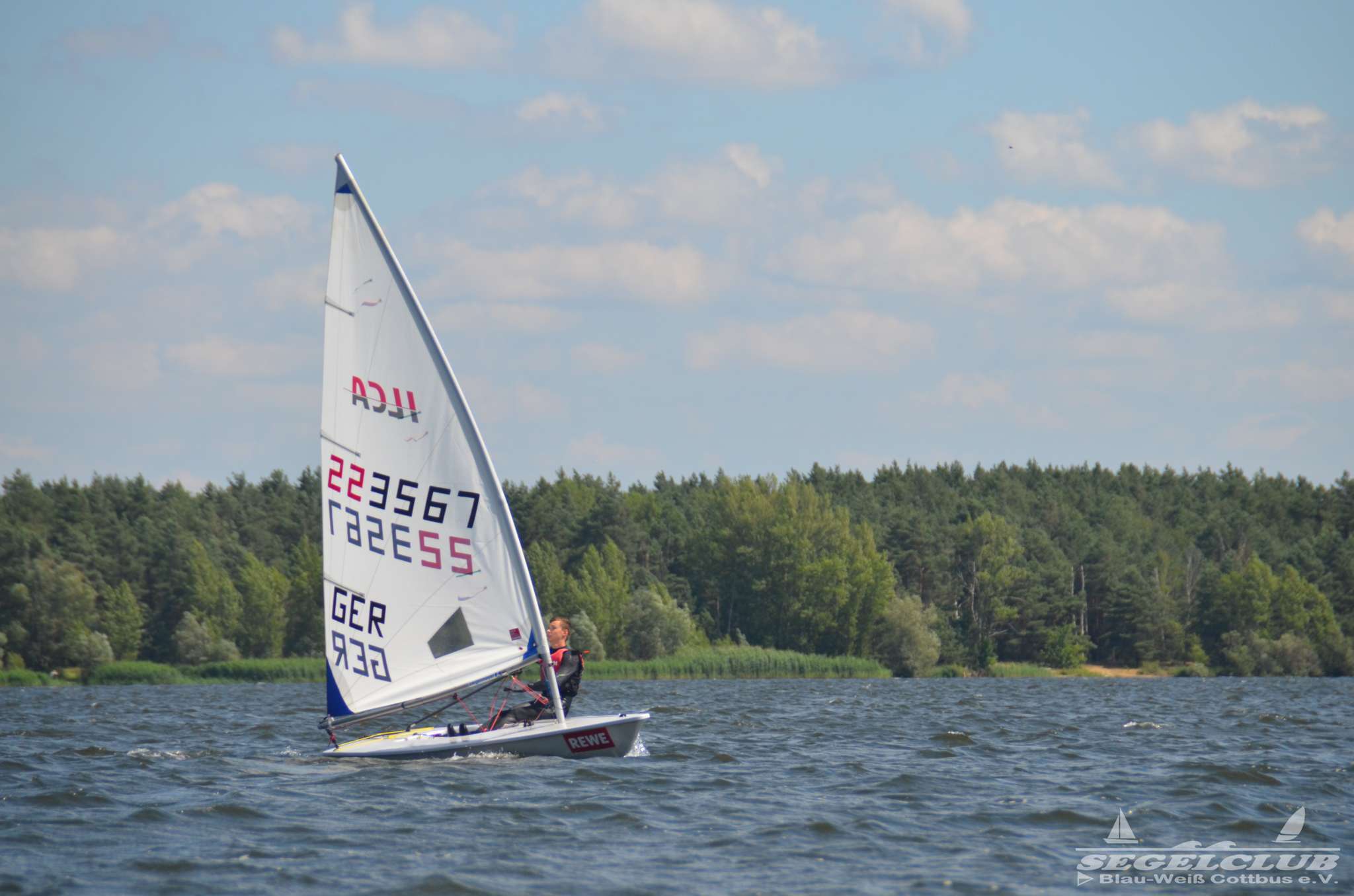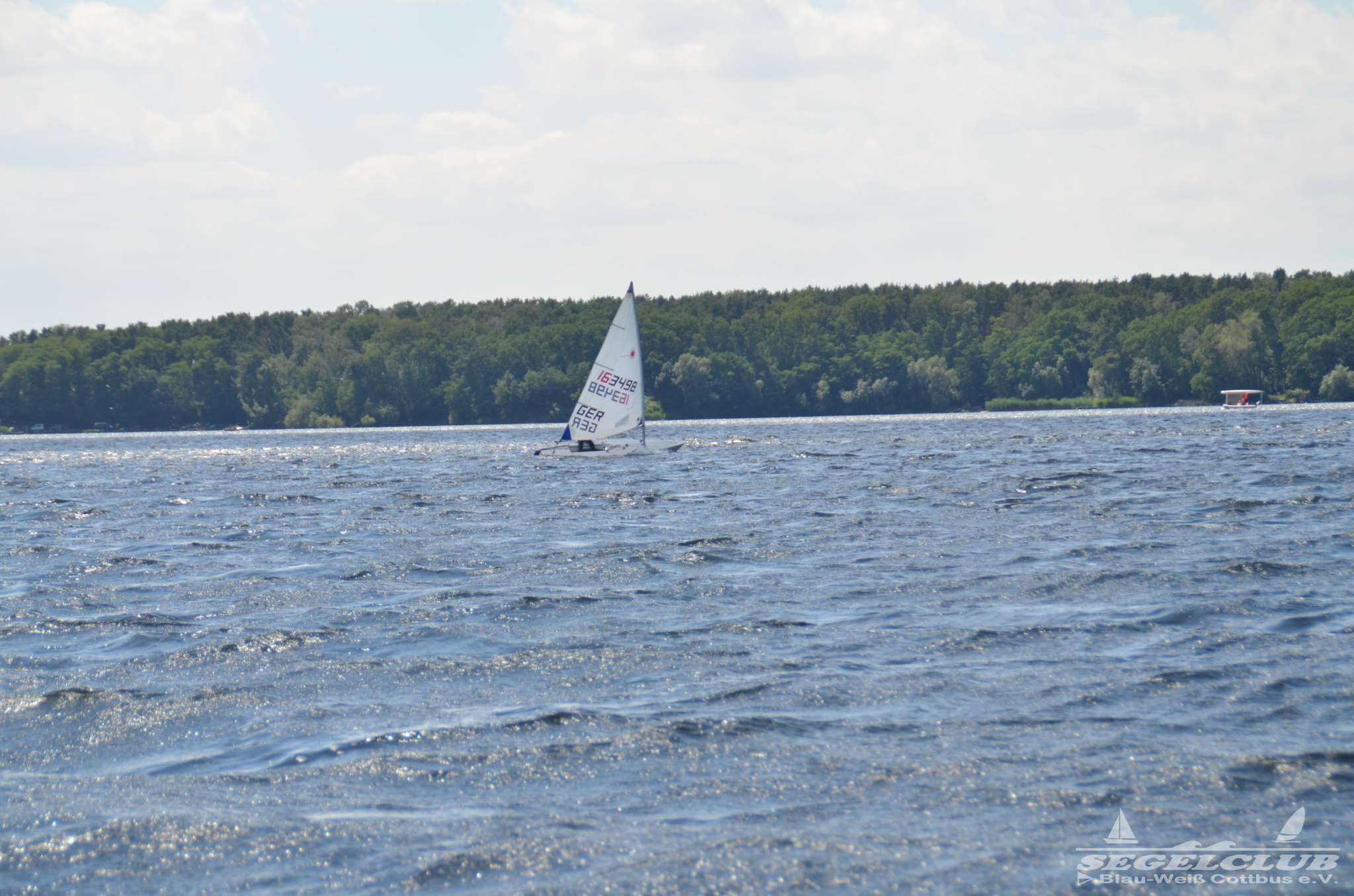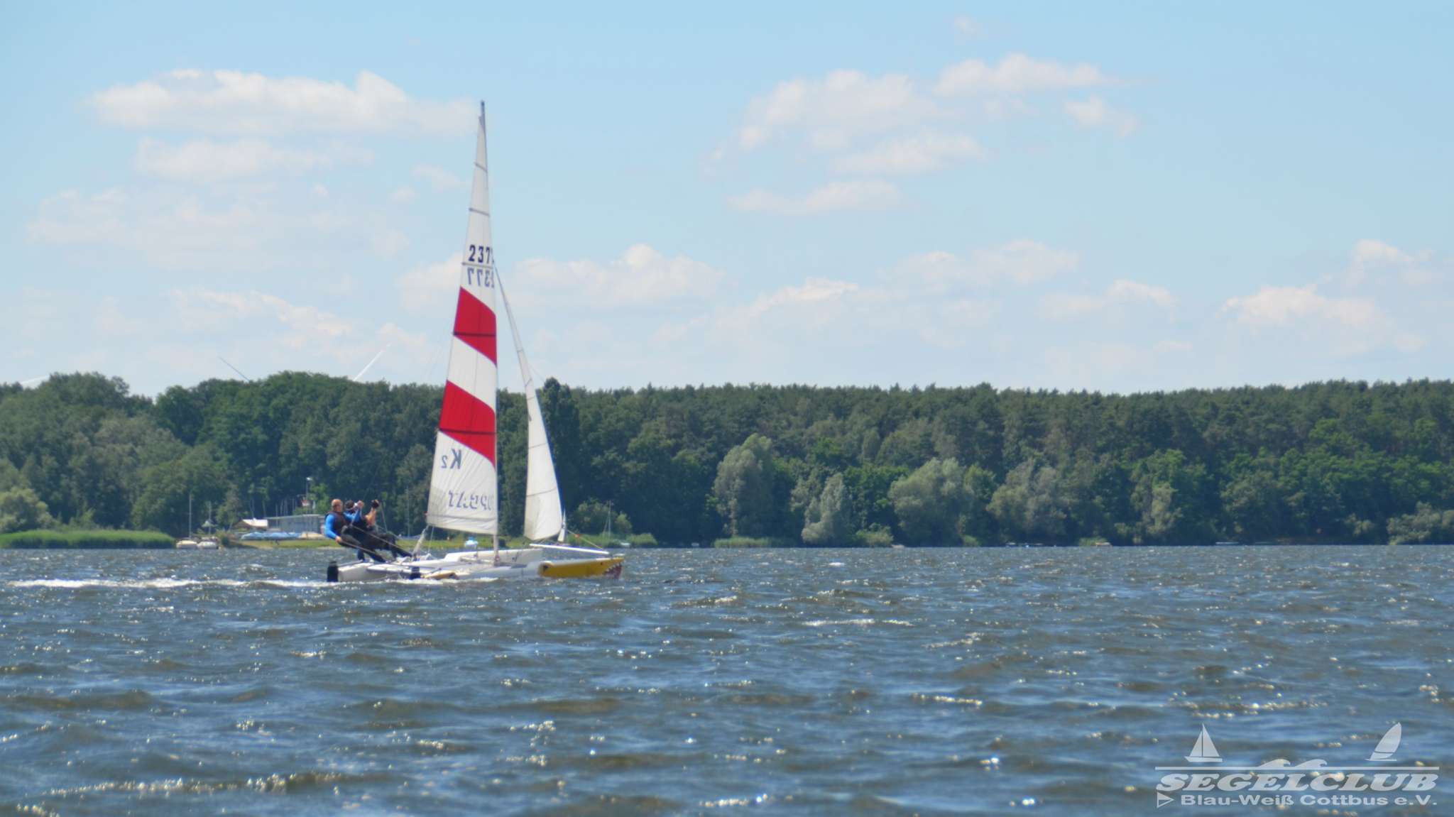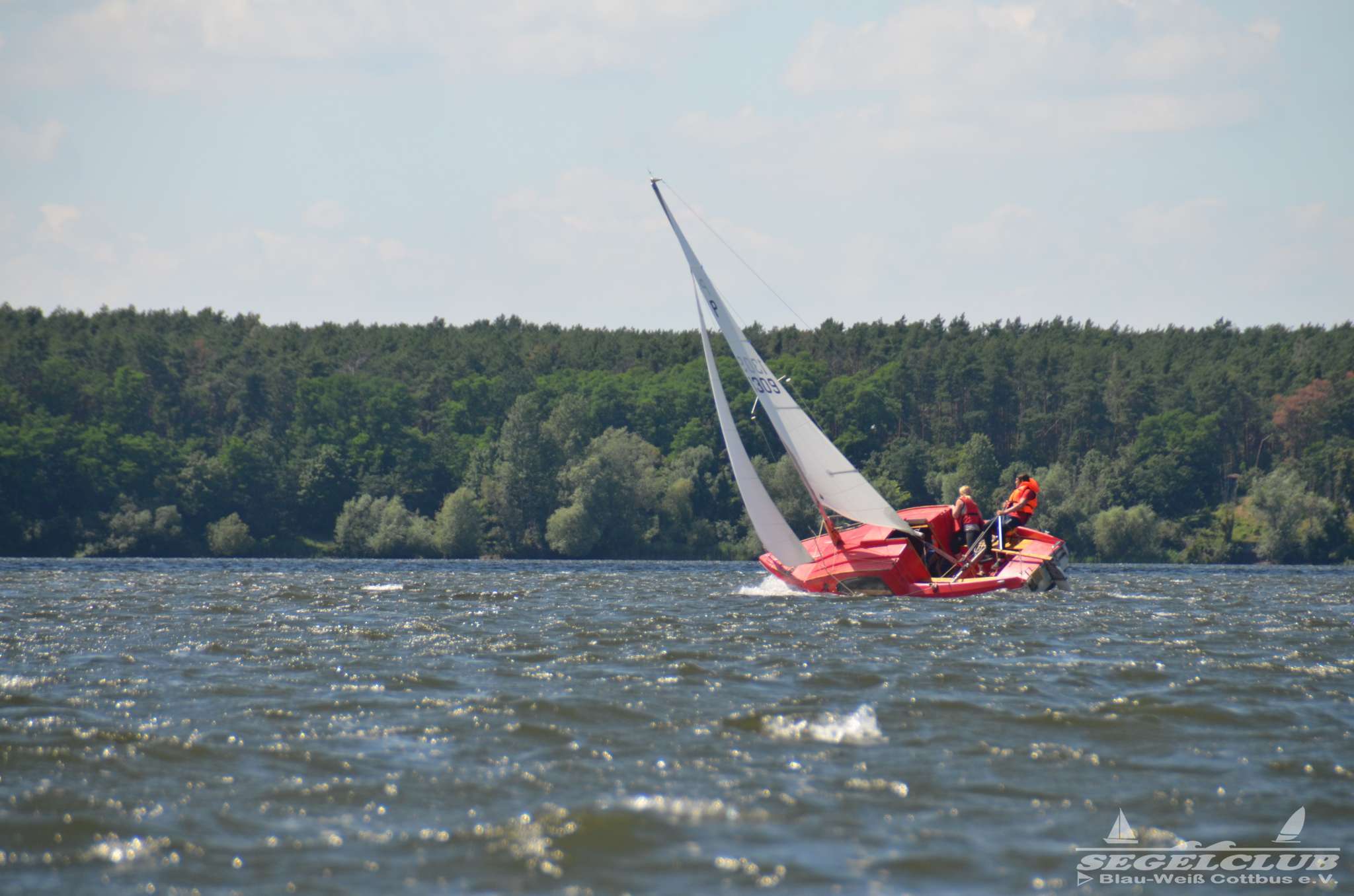Zunächst ein paar Sätze zur Langstreckenregatta. Die Sommersonnenwende Ausfahrt wird in einem seperaten Beitrag behandelt. Bekanntermaßen wird nur eine Wettfahrt gesegelt, welche dafür aber wie der Name schon sagt eine recht lange ist. Wir hatten ordentlich Wind so das auf der Kreuz eigentlich dauerhaftes Ausreiten bzw. Trapez gestütztes Fahren angesagt war. Der Kurs hat mir persönlich sehr gut gefallen, es wurden drei wirklich große Dreiecke gefahren. Wobei die Schläge von Tonne 1 zu 2 und von Tonne 2 zu 3 richtig richtig lang waren. Das sind die Raumschläge, hier konnte man schön mit dem Wind arbeiten und bei Wind-schwachen Stellen luven und bei einsetzenden Böen dann abfallen und mit voll Speed los rocken. Die Kreuz war sehr gut ausbalanciert und dank der klaren Winddreher konnte man taktisch viel machen.