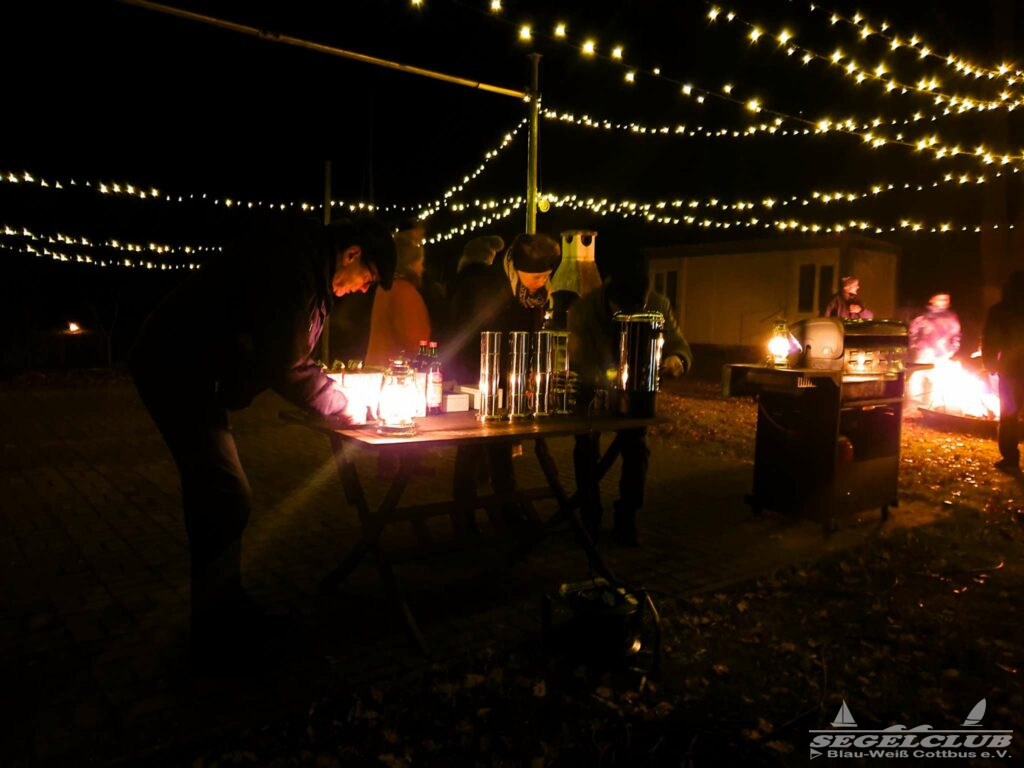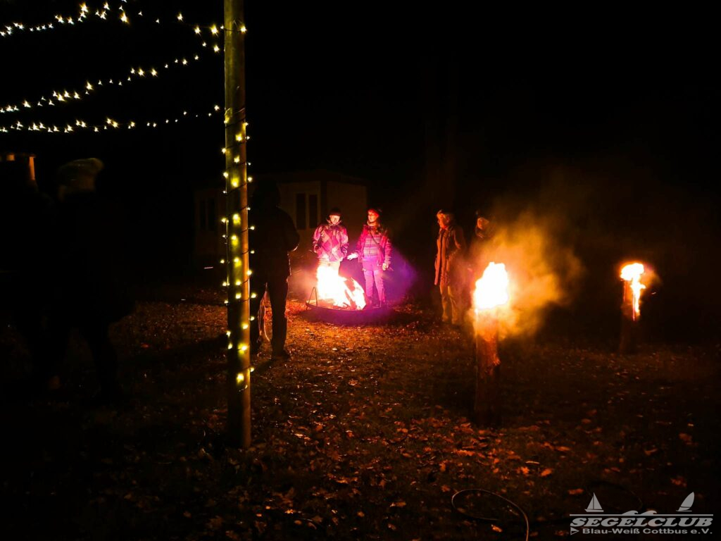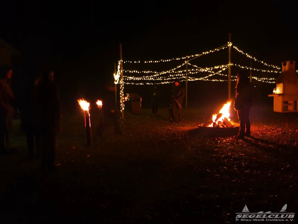 Mit wärmendem Feuer, Schwedenfackeln, Glühwein und Punsch aber auch einer warmen Bratwurst klönten wir vor unserem Bootshaus und brachten uns auf den neuesten Stand.